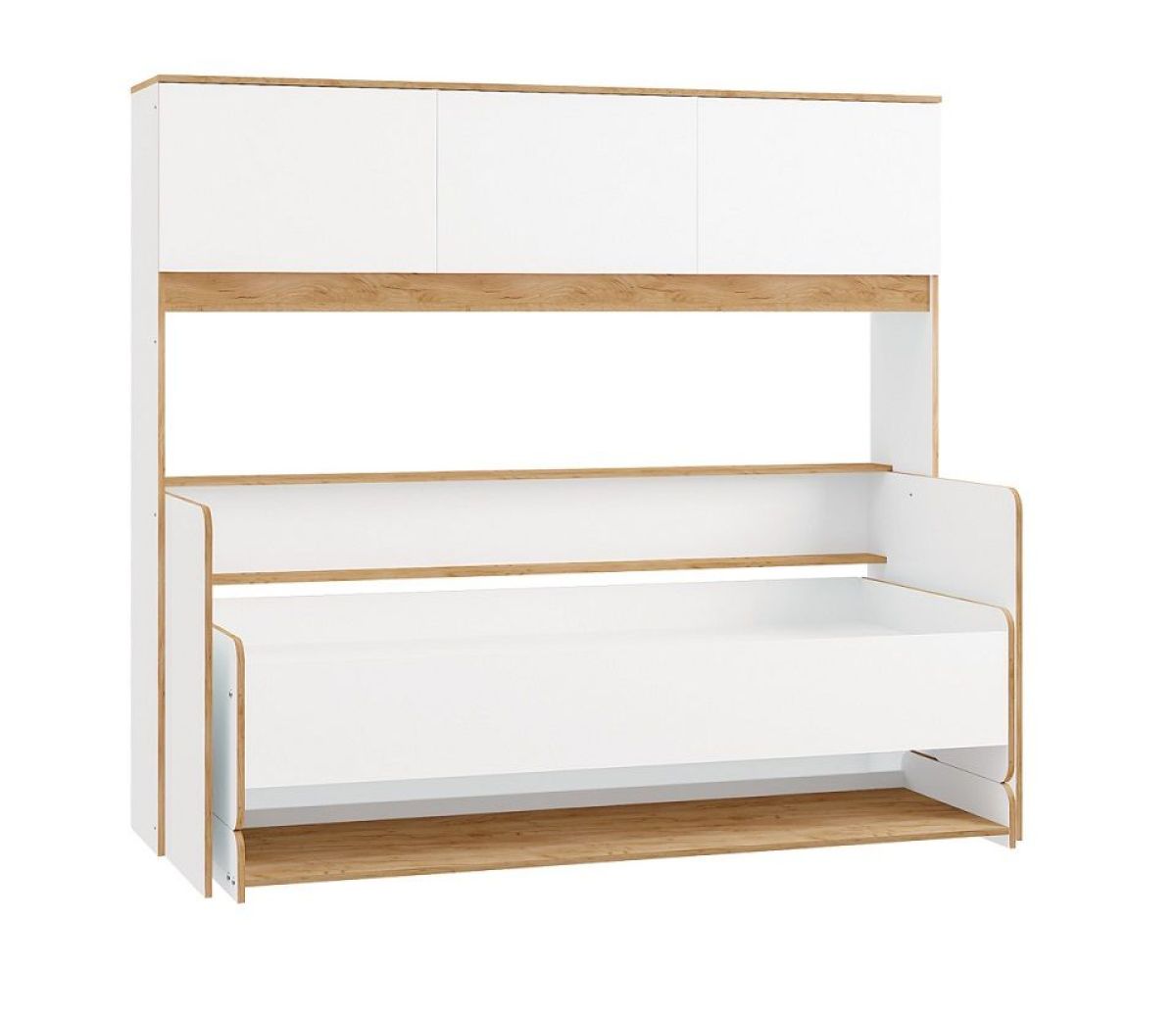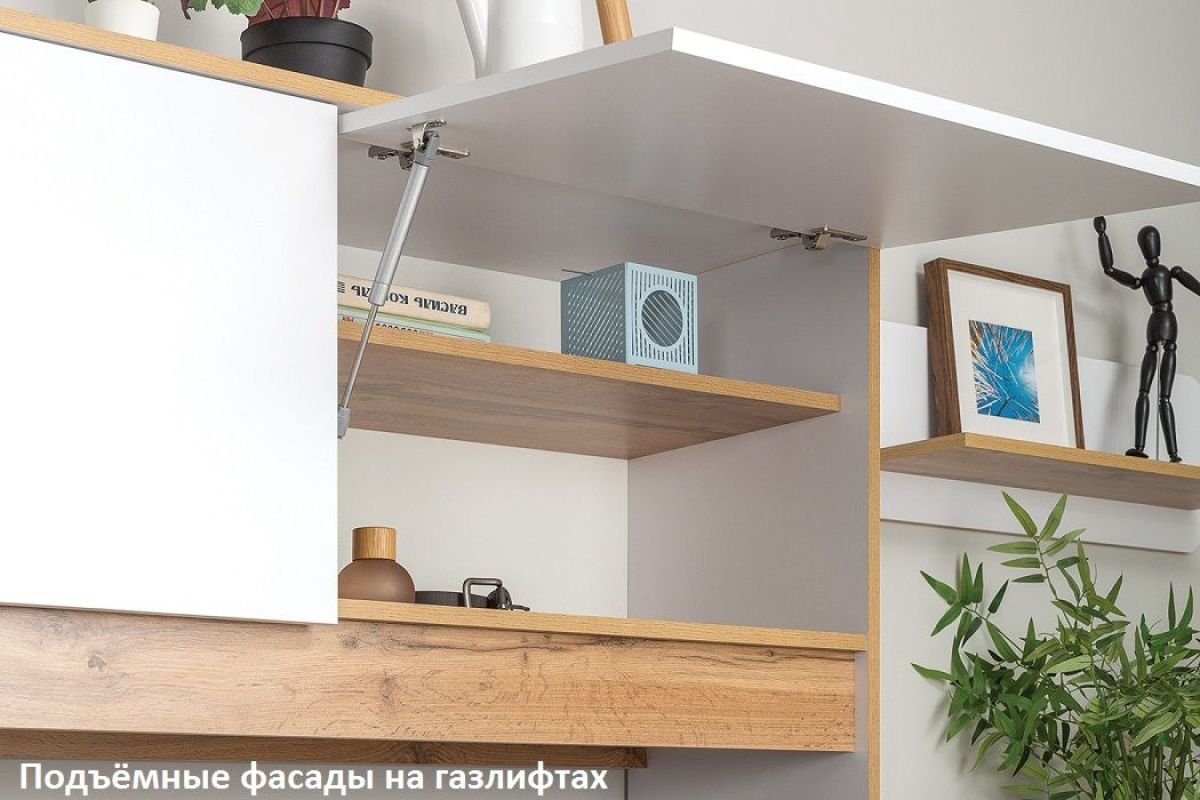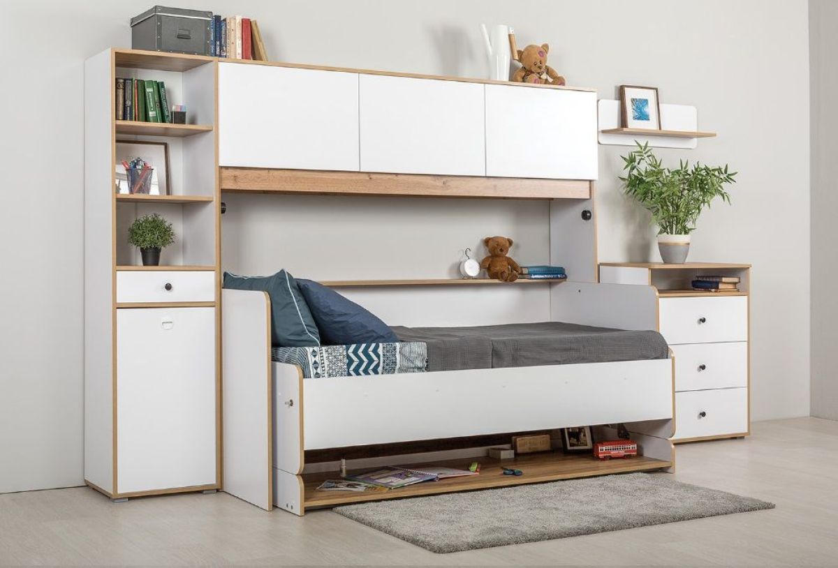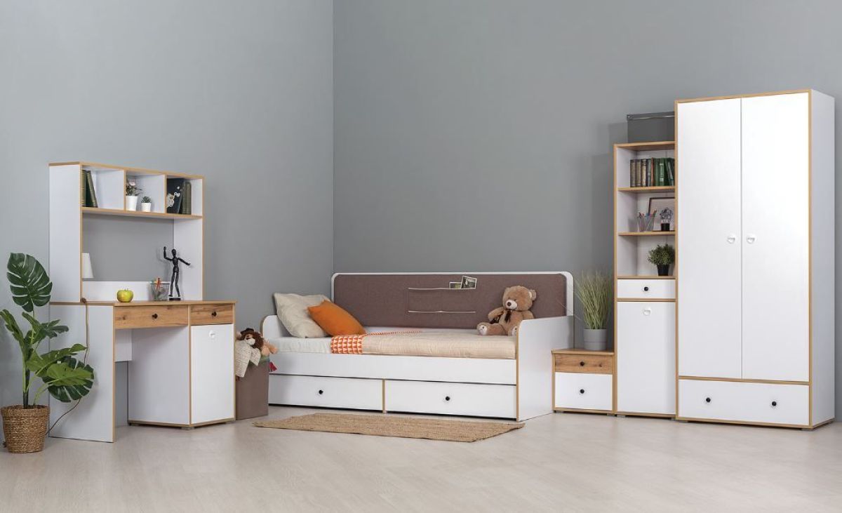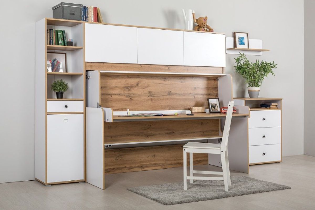 Светлая и аккуратная молодёжная мебель. Основой модульной системы является кровать-трансформер. Её столешница имеет постоянный горизонт, то есть при трансформации не нужно убирать вещи. Система хранения с подъёмными фасадами значительно расширяет функционал. Также имеются письменный стол с надстройкой и полкой, шкафная группа и комод с тумбочкой. Вместе они позволяют создавать разноразмерные композиции.