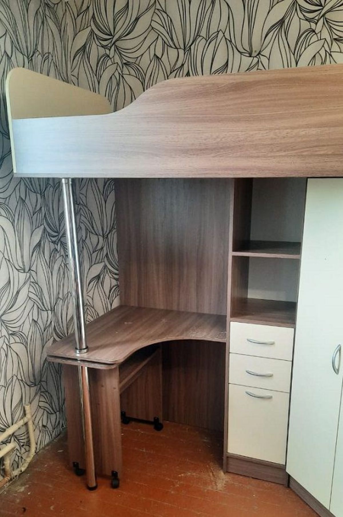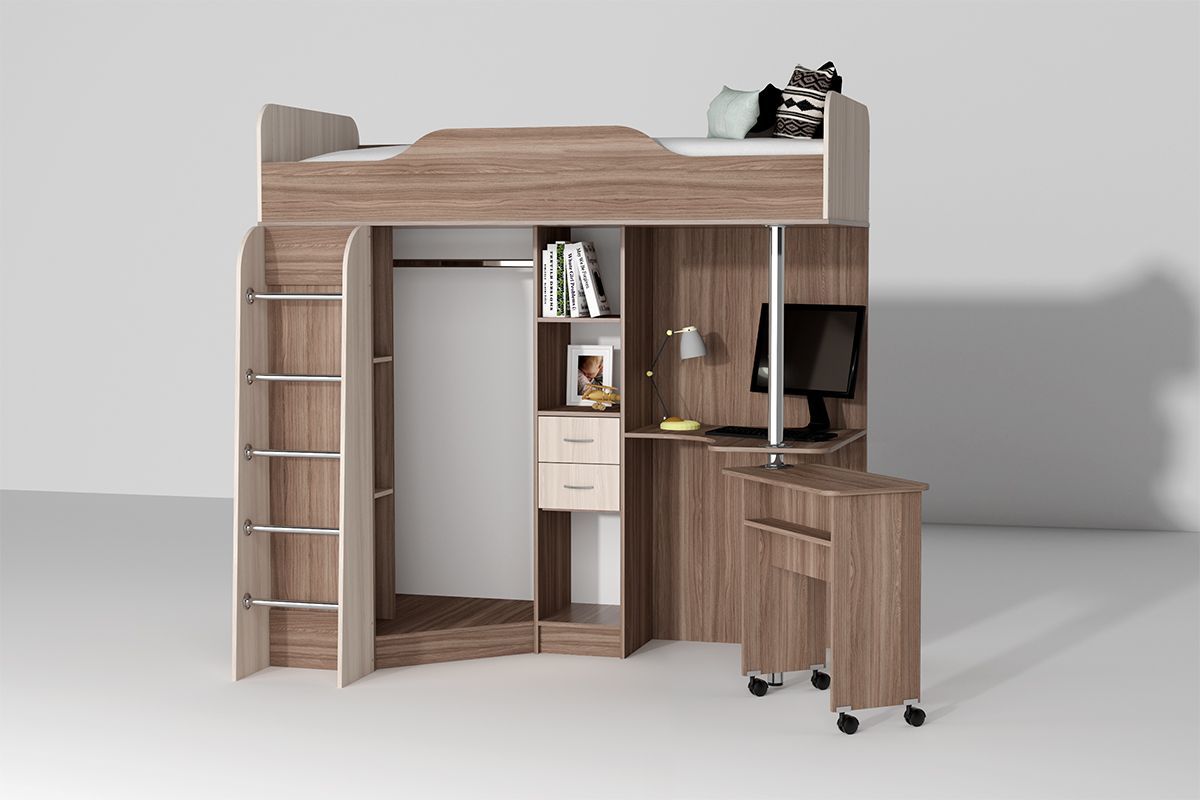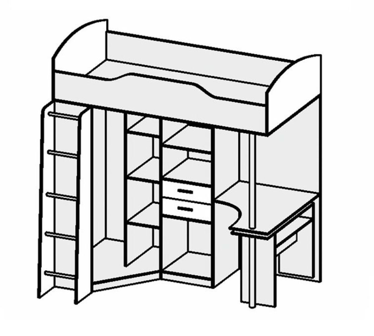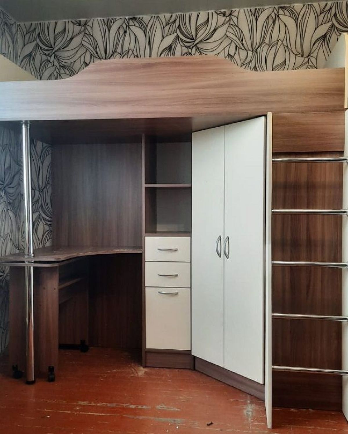 В комплект входит: кровать, внизу которой расположены вместительный угловой шкаф (полки и штанга), стеллаж для книг и компьютерный стол с дополнительным столиком.