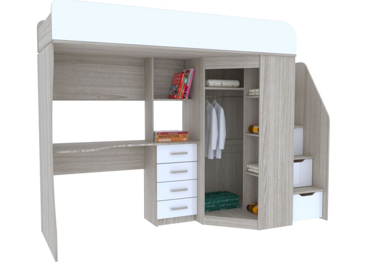 Кровать-чердак подростковая Антилия (Дуб Крафт белый/Белый глянец)