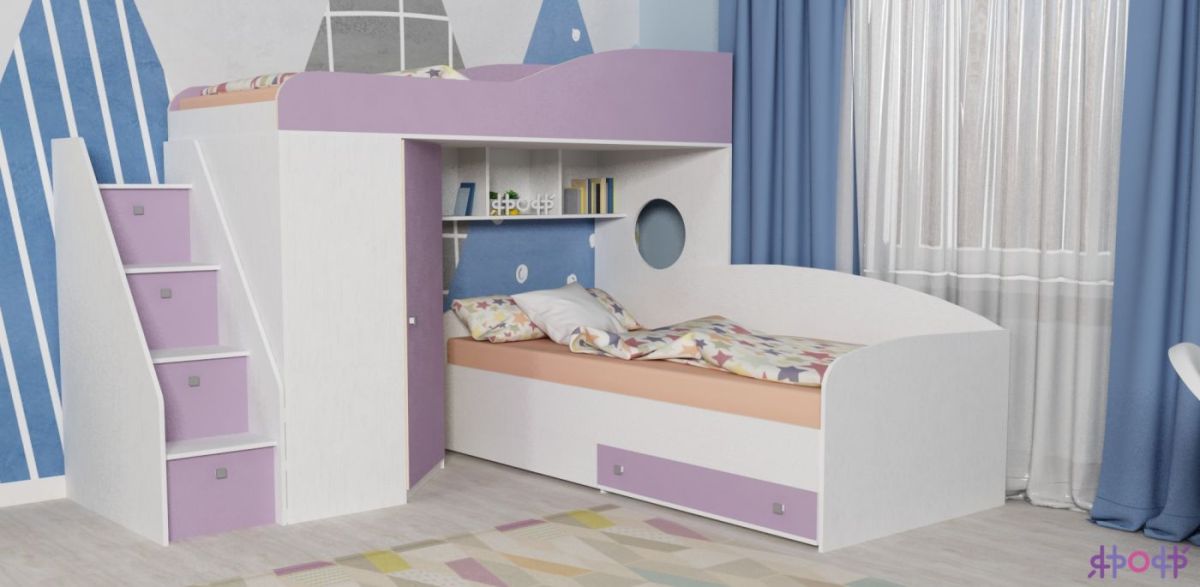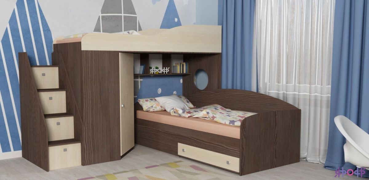 Такая кровать придется по душе и ребенку младшего школьного возраста, и подростку. Два просторных спальных места, четыре глубоких вместительных выдвижных ящика, замаскированных под ступеньки, вертикальный шкаф для одежды и компактные полочки для сувениров - все это дает колоссальную экономию места в Москве. Это особенно актуально для небольших малогабаритных помещений. Сочетание прямых, диагональных и плавных линий создает оригинальный дизайн.
