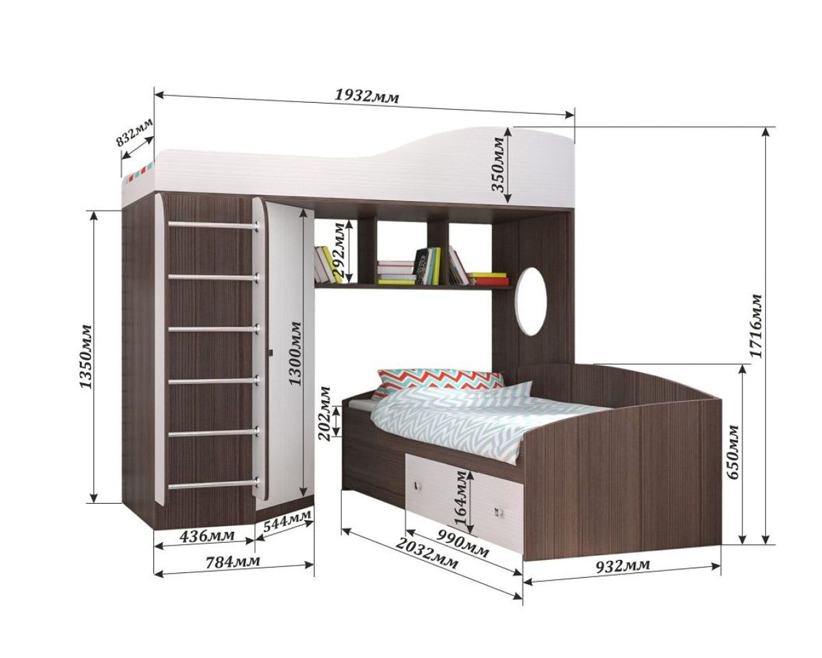 Спальное место: НИЗ - 900*2000 мм / ВЕРХ - 800*1900 мм
