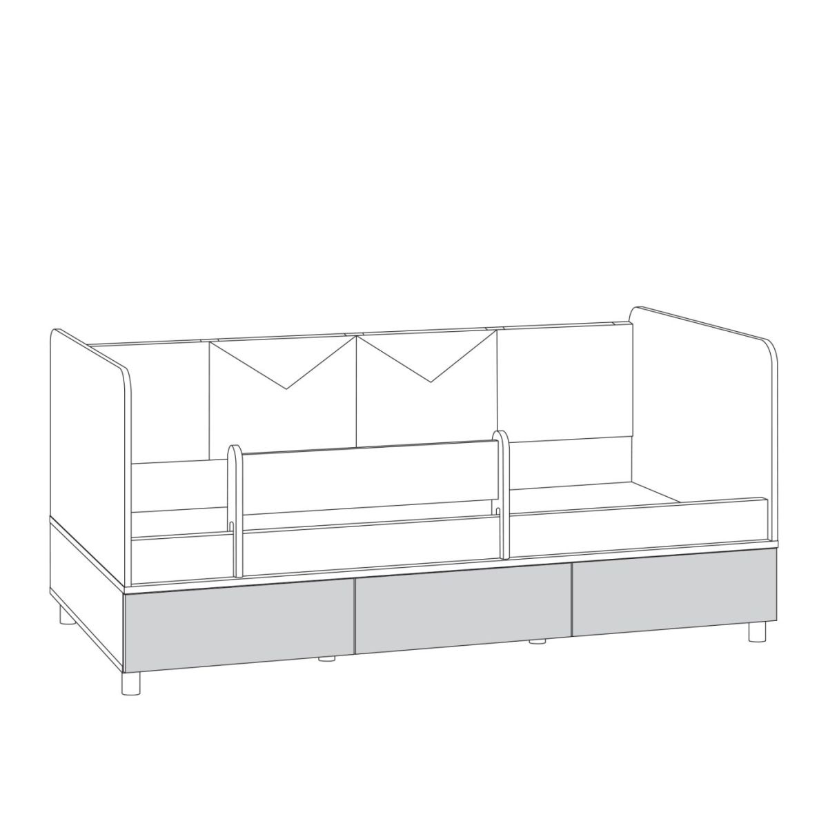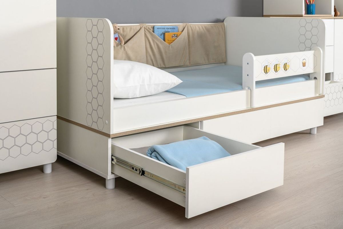 Кровать оснащена съёмным мягким элементом с карманами, передвижным бортиком и декорирована оригинальным рисунком - мультяшными пчёлками, которые никого не оставят равнодушным. Система хранения.