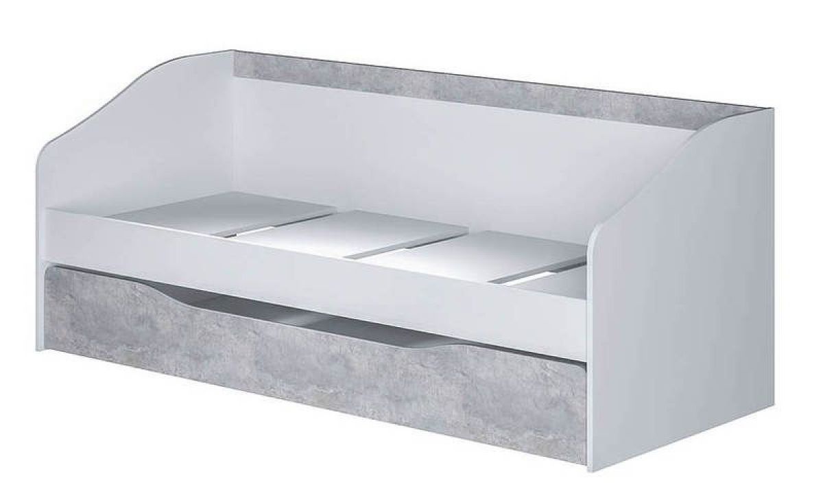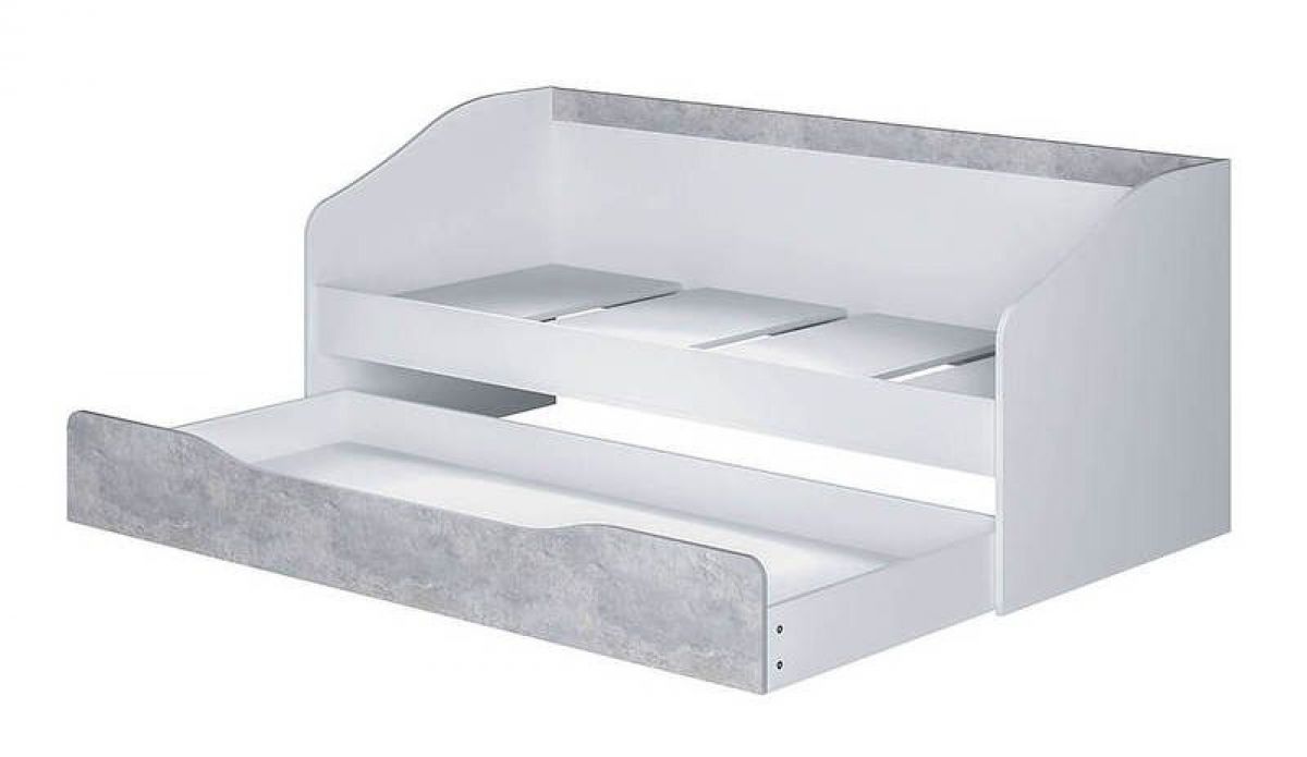 Детская кровать Паскаль выполнена из ЛДСП в комбинации двух цветов белый и цемент светлый • большой выдвижной ящик станет отличным местом хранения для необходимых вещей или игрушек, • выдвижной ящик можно использовать как второе спальное место 1860*800 мм, • к кровати можно подобрать письменный стол, навесную полку или шкаф из одноименной модульной коллекции мебели. Лучшее решение по приятной цене — это детская кровать Паскаль.