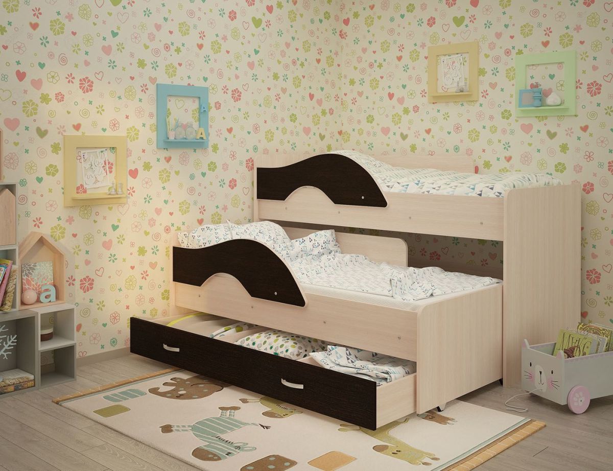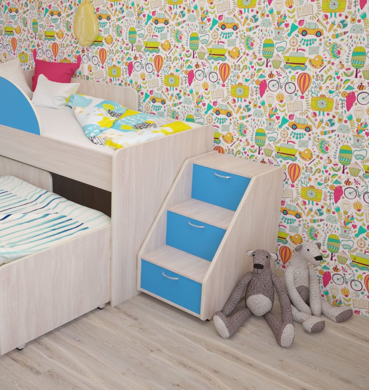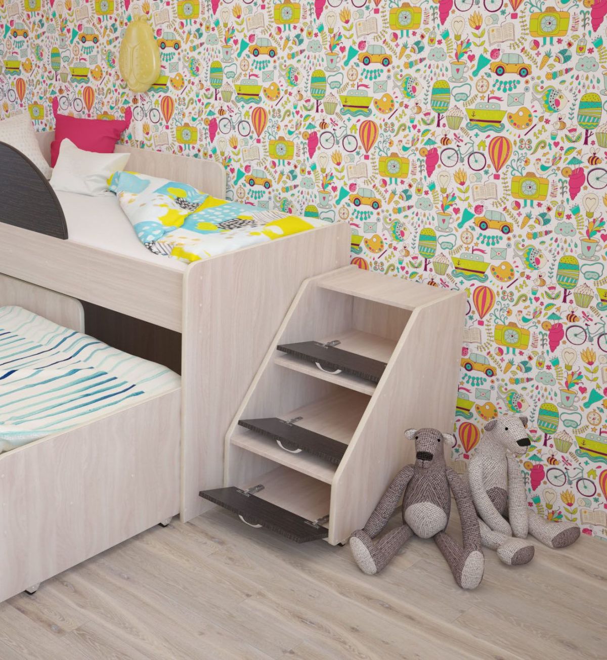 Экономия пространства является главным преимуществом такой конструкции в комнатах, где есть двое детей. Почти два квадратных метра освобождается при поднятии второго спального места на второй ярус. А это — свободное пространство, чистый воздух и большая по размеру игровая зона на полу!
