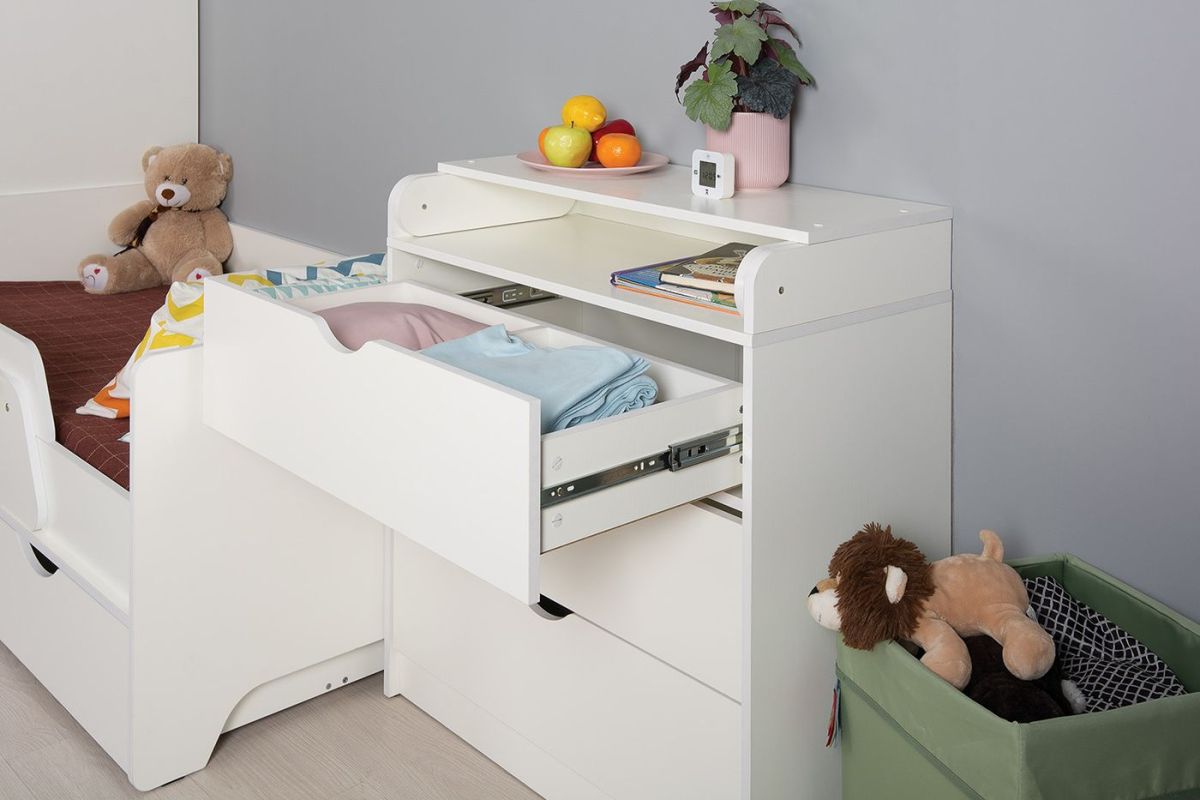 На всех изделиях ручками служат вырезы в фасадах, все выдвижные ящики имеют внутренние перегородки для лучшей организации хранения.
