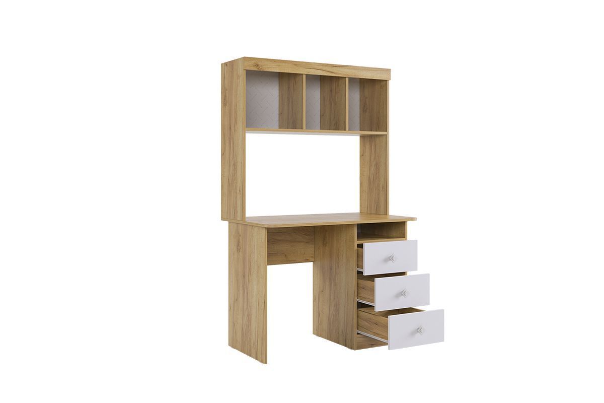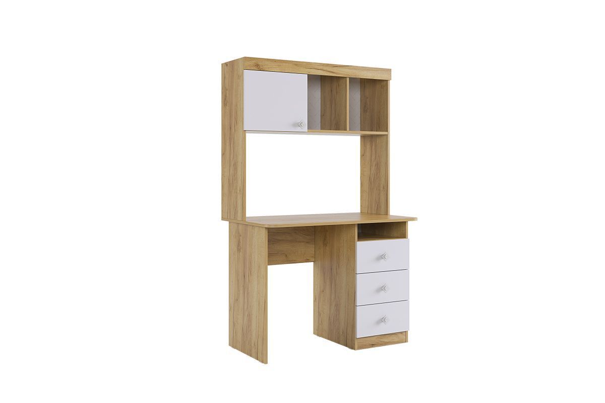 Состоит из: столешницы, 3-х выдвижных ящиков и полки для книг с закрытой нишей и открытыми полками.