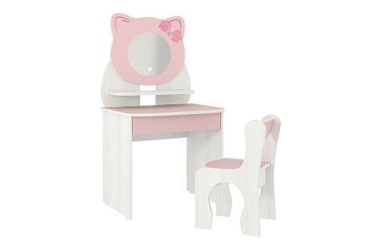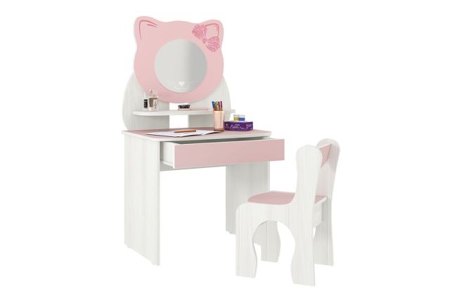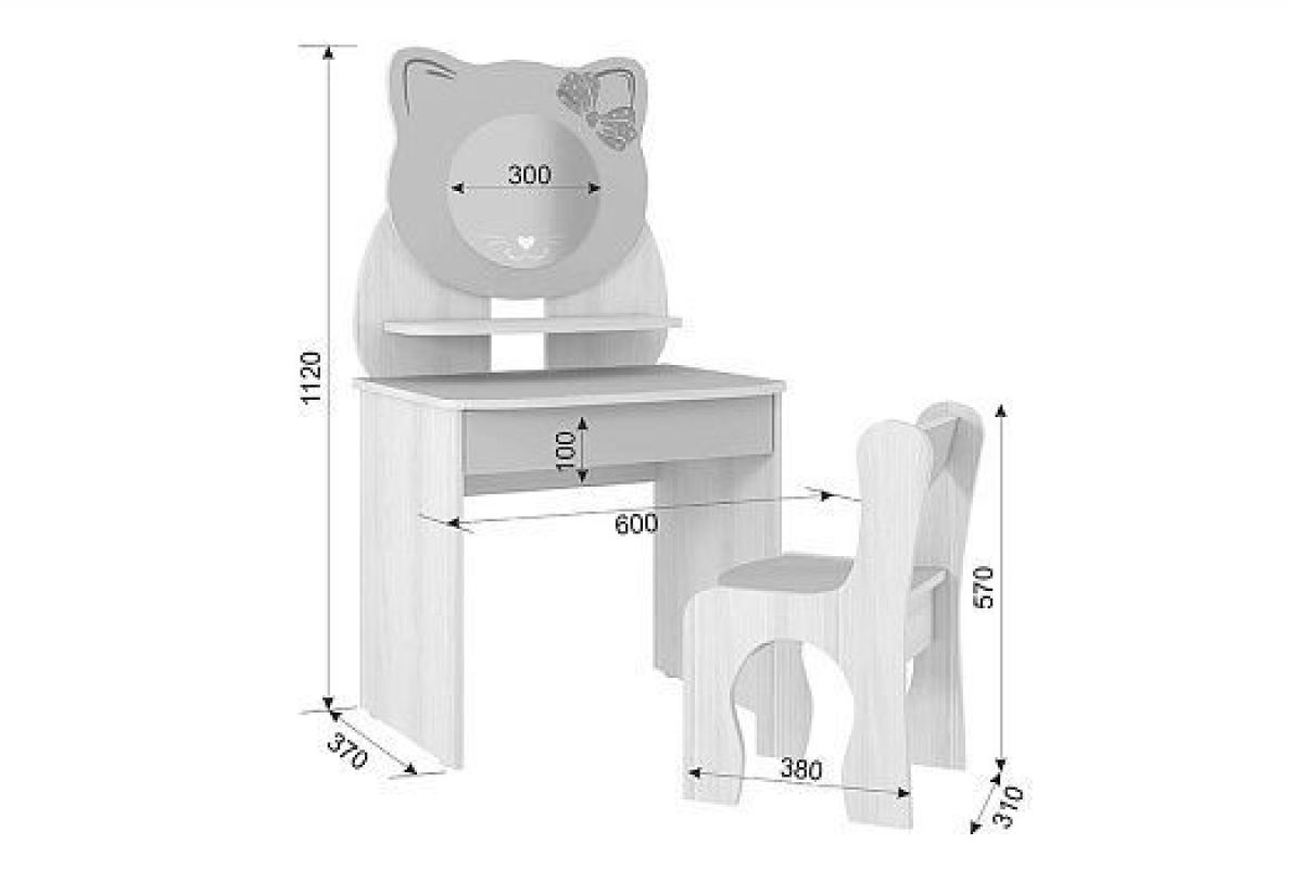 Состоит из: стула и стола с зеркалом, полками и выдвижным ящиком. Изделие симметричное.