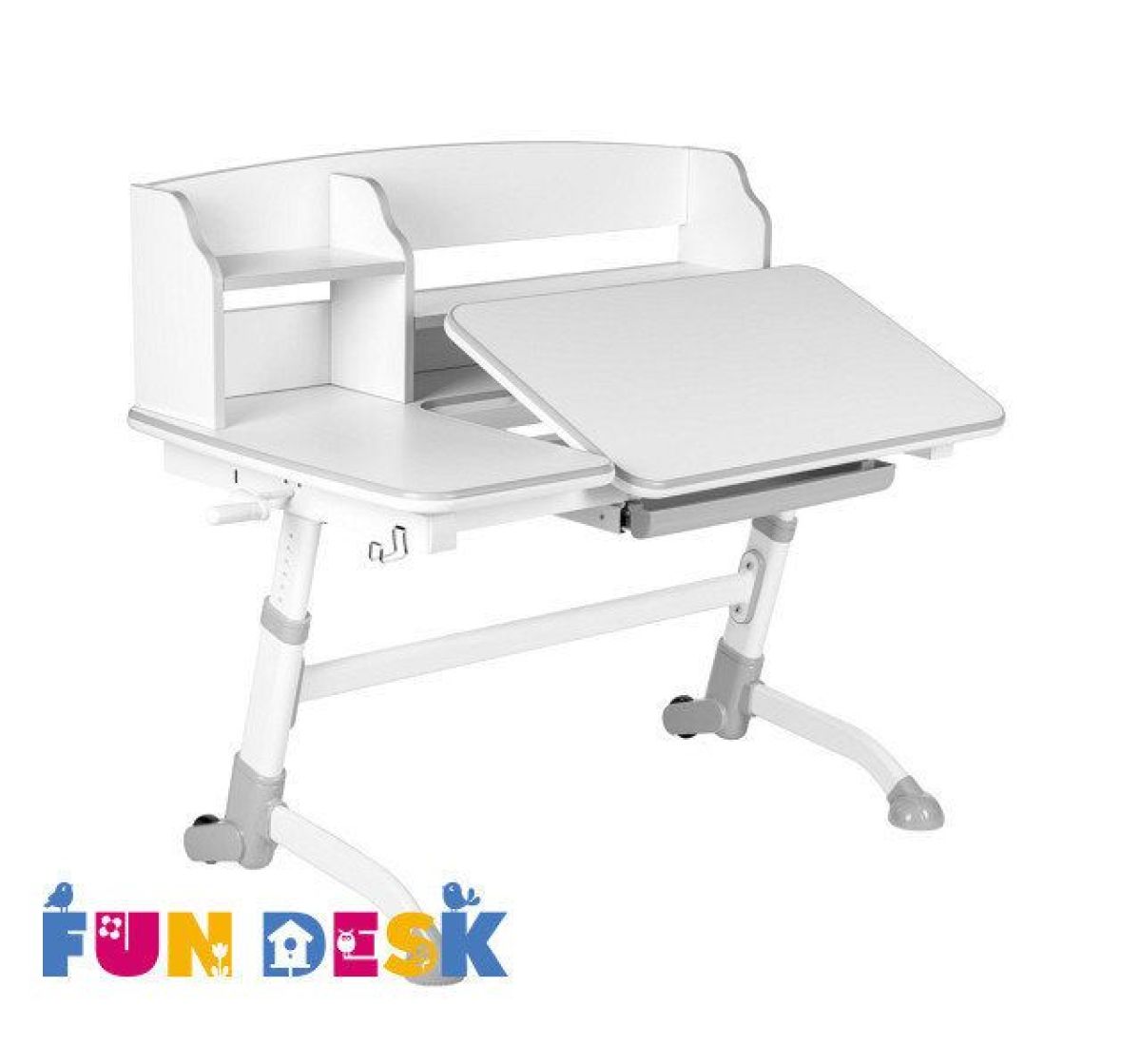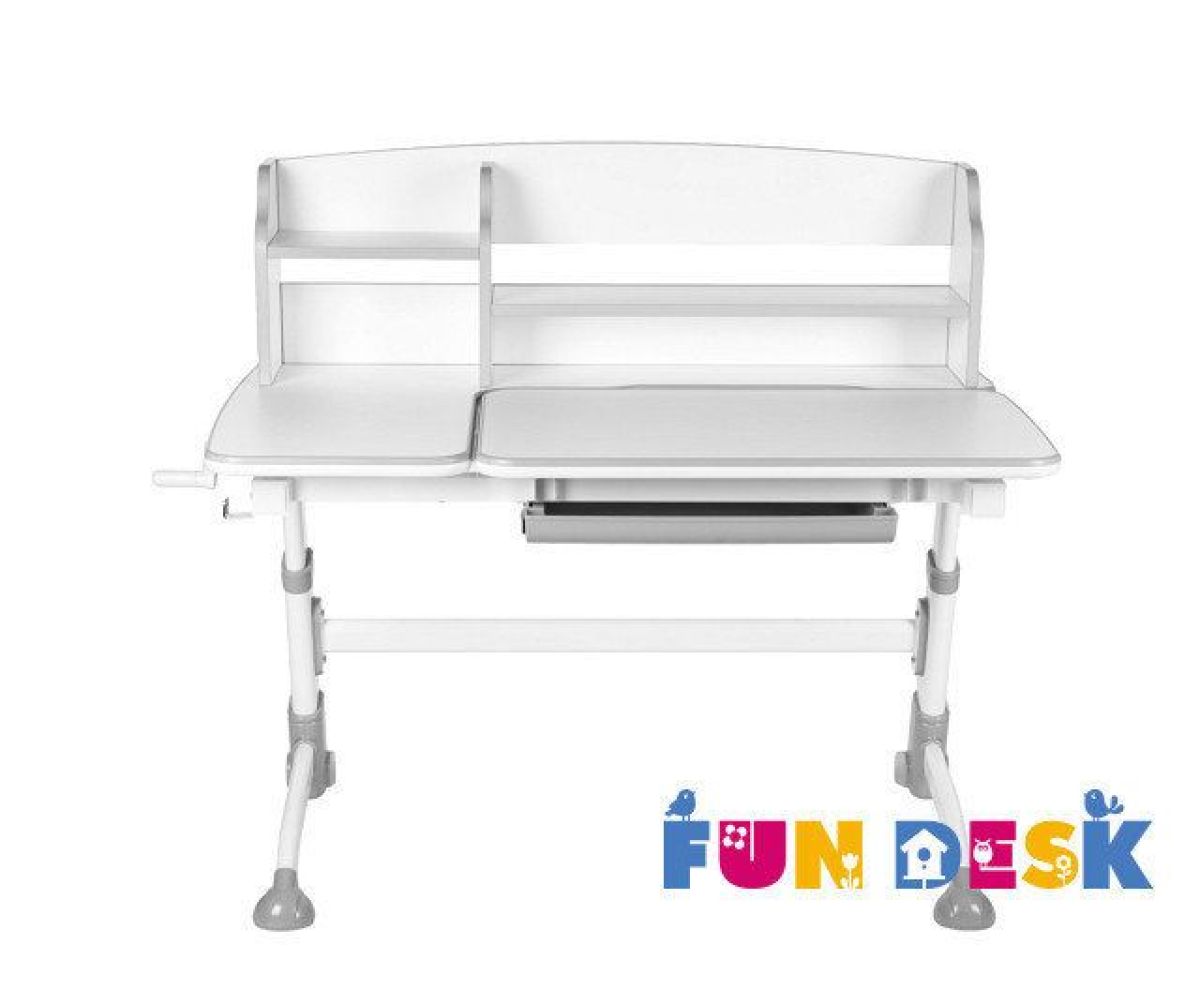 • Регулируемая детская парта FunDesk Amare II  – эргономичный, регулируемый по высоте, с современным дизайном и навесной полкой стол для вашего ребенка. Наличие полок над столешницей увеличивает рабочее пространство, создавая дополнительное место для хранения книг и канцелярских принадлежностей. Наклоняемая до 25° рабочая поверхность дает возможность выбрать максимально удобный угол наклона для письма, чтения и рисования. Антибликовое покрытие столешницы защищает глаза вашего ребенка от усталости. Благодаря многоступенчатому механизму регулировки высоты парта «растет» вместе с вашим ребенком. Наличие колесиков позволяет легко перемещать парту, не повреждая пол.