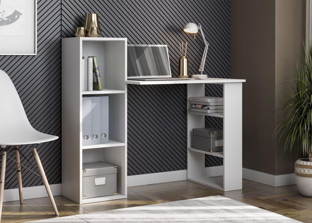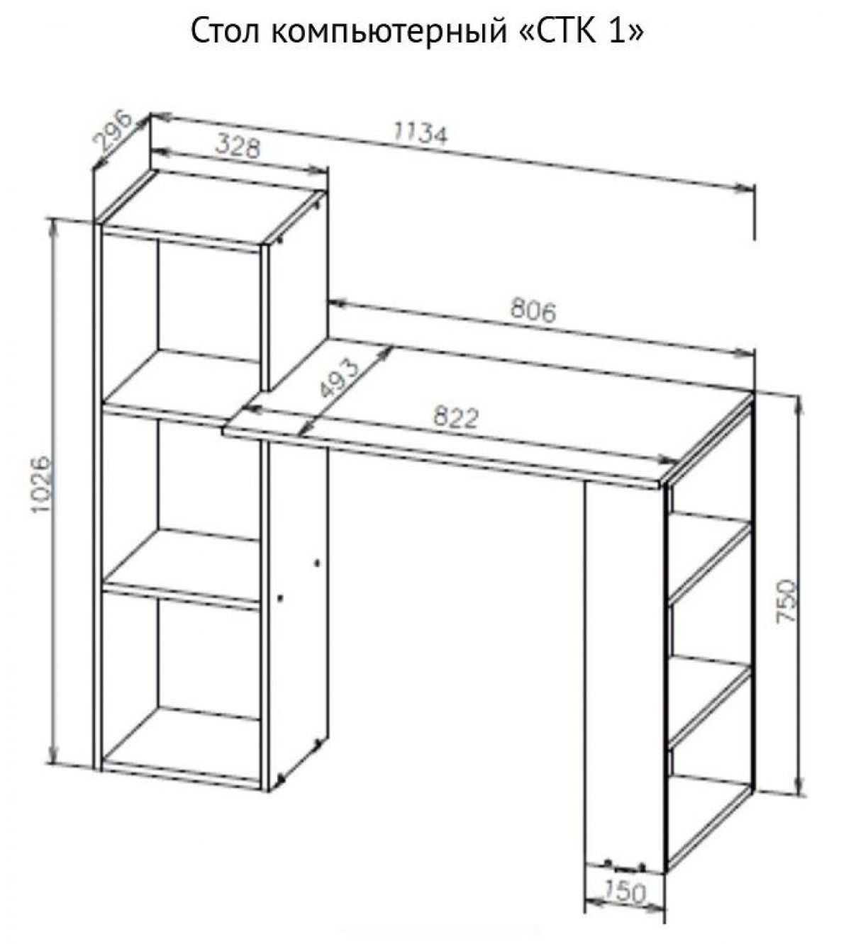 Компактный компьютерный стол «СТК 1» со столешницей размером 822*493 мм. С одной стороны столешница опирается на открытый стеллаж размером 150*734*460 мм с двумя полками. С другой стороны столешница пристыковывается к открытому пеналу размером 328*1026*296 мм также с двумя полками.