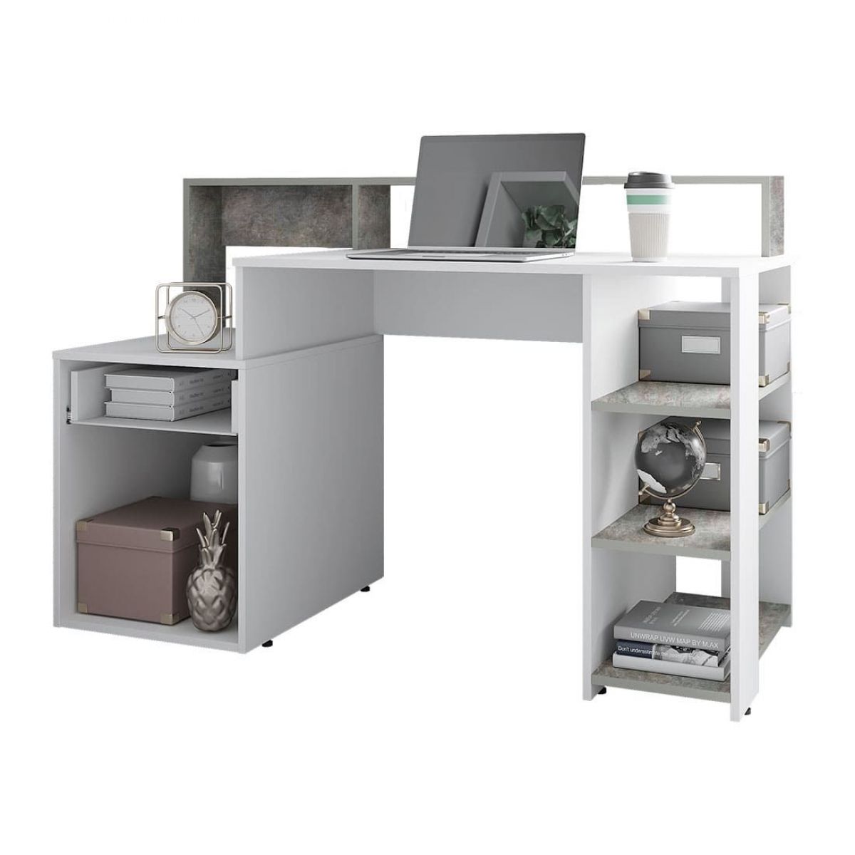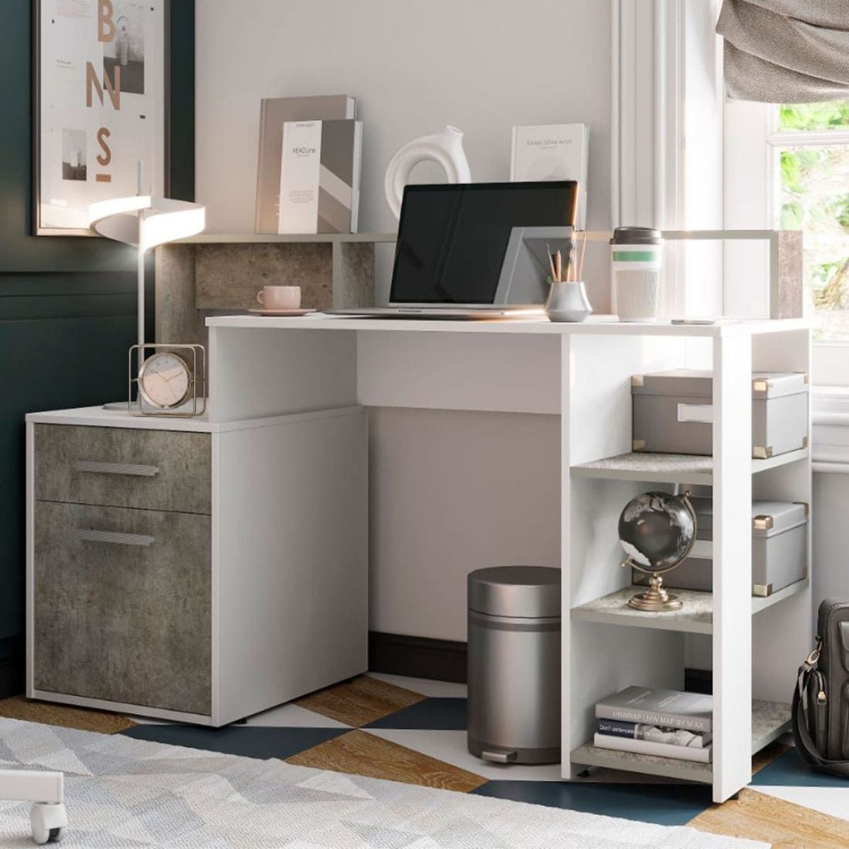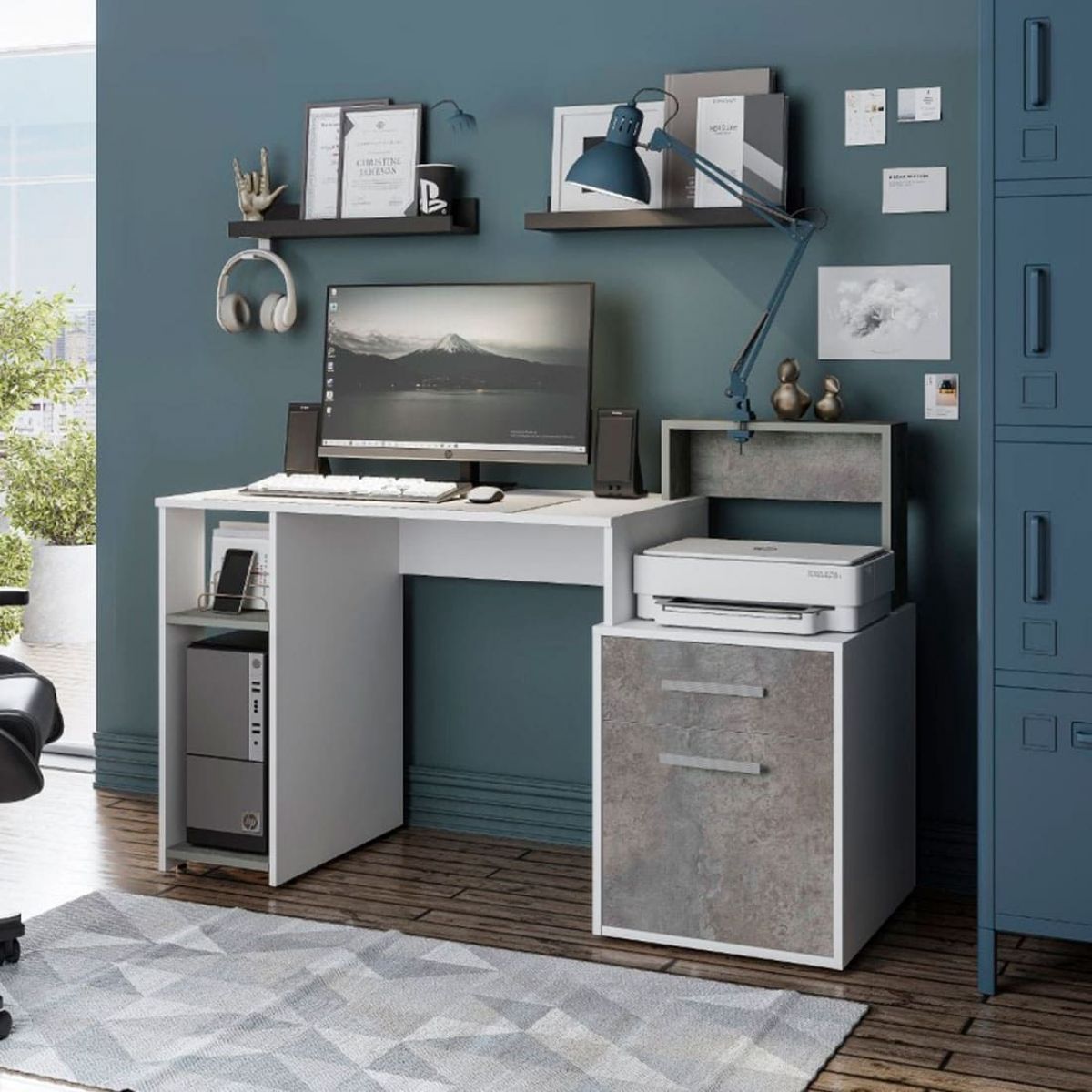 Компьютерный стол Лайф – это не просто стол, это полноценно оборудованное рабочее место. Модель состоит из вместительной столешницы, открытых и закрытых полок, а также небольшого выдвижного ящика для мелких вещей. Изделие выполнено из ЛДСП в сочетании цветов белый и метрополитан грей, оно прекрасно впишется в светлый современный интерьер. Красивое решение по лучшей цене — это стол компьютерный Лайф в компании «Семья Мебелони».