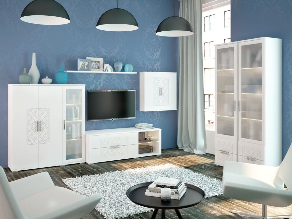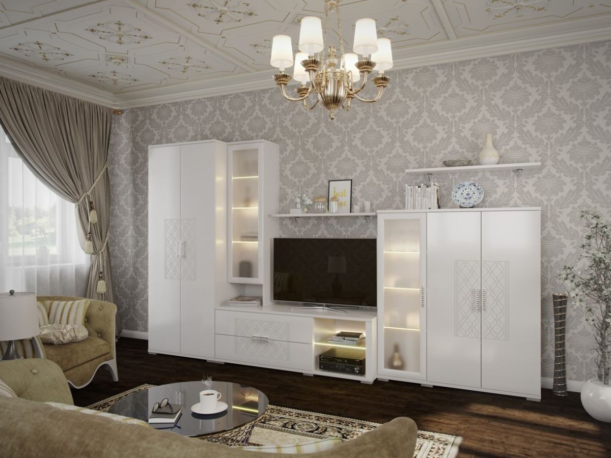 Стенка «Тиффани» - стенка в стиле Классика для любой современной гостиной. Эта стенка легкая, изящная и соответствует самым изысканным вкусам современного потребителя. Стенка с глянцевым фасадом мдф современное, стильное, функциональное решение для гостиной.