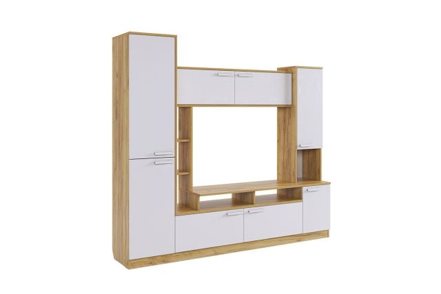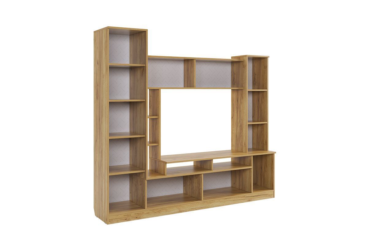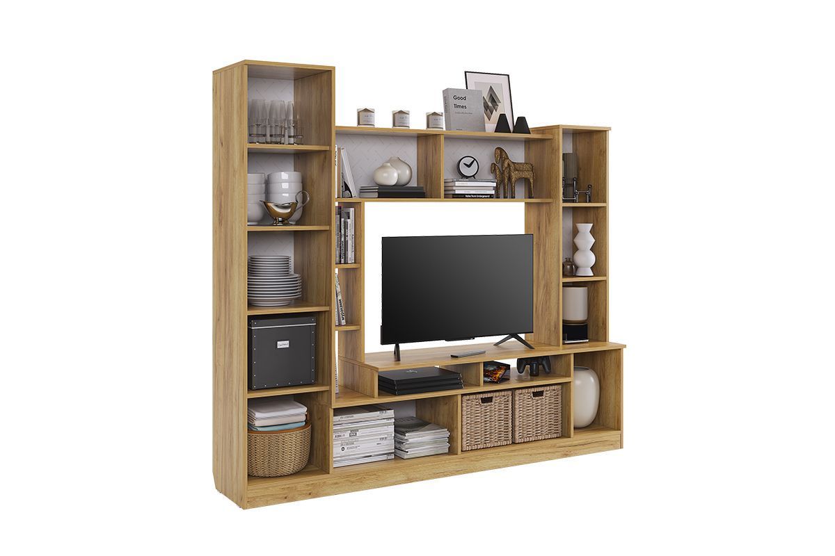 Состоит из: открытых полок, закрытых полок, ниши под телевизор.