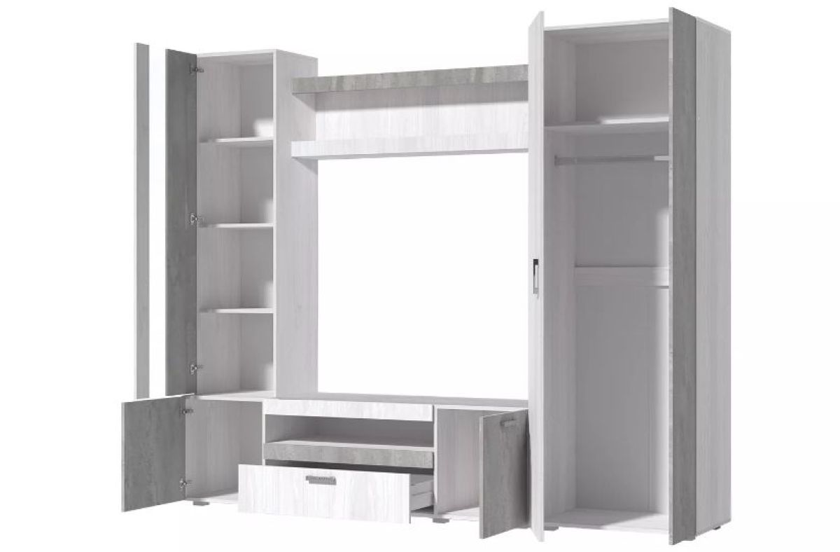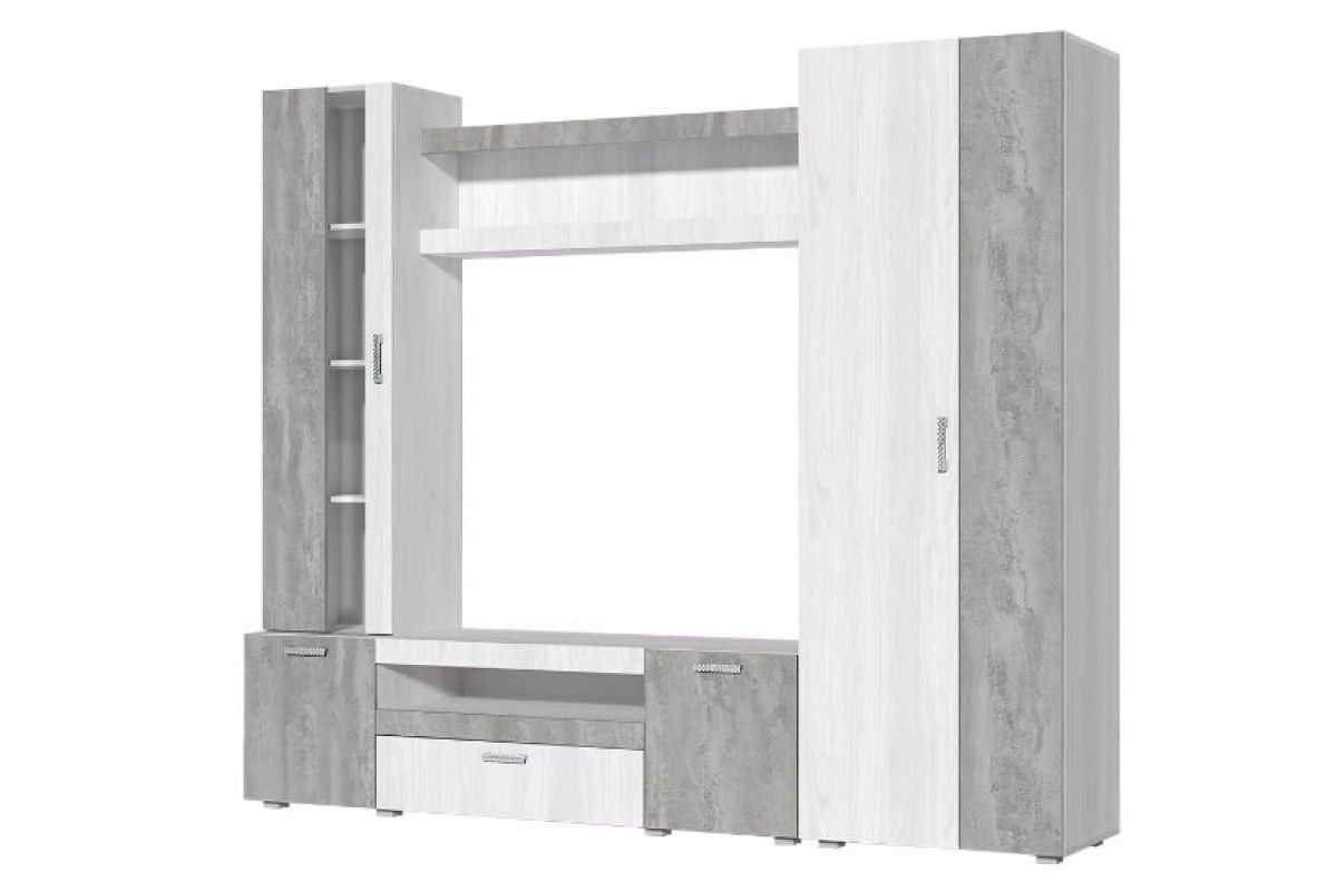 Данная стенка выполнена в современном сочетании цветов ясень анкор светлый с бетонным камнем.