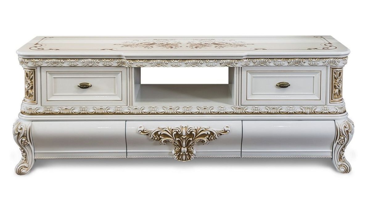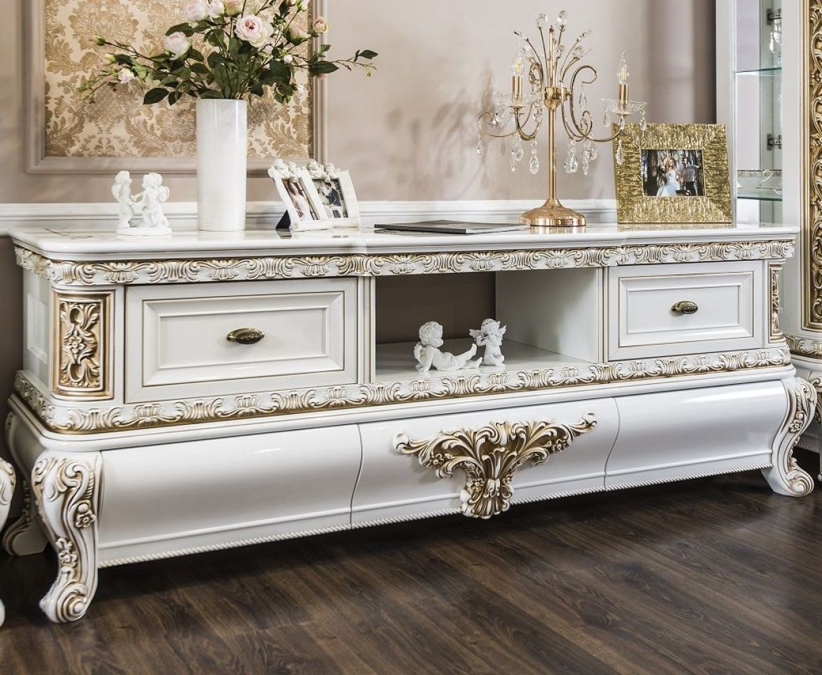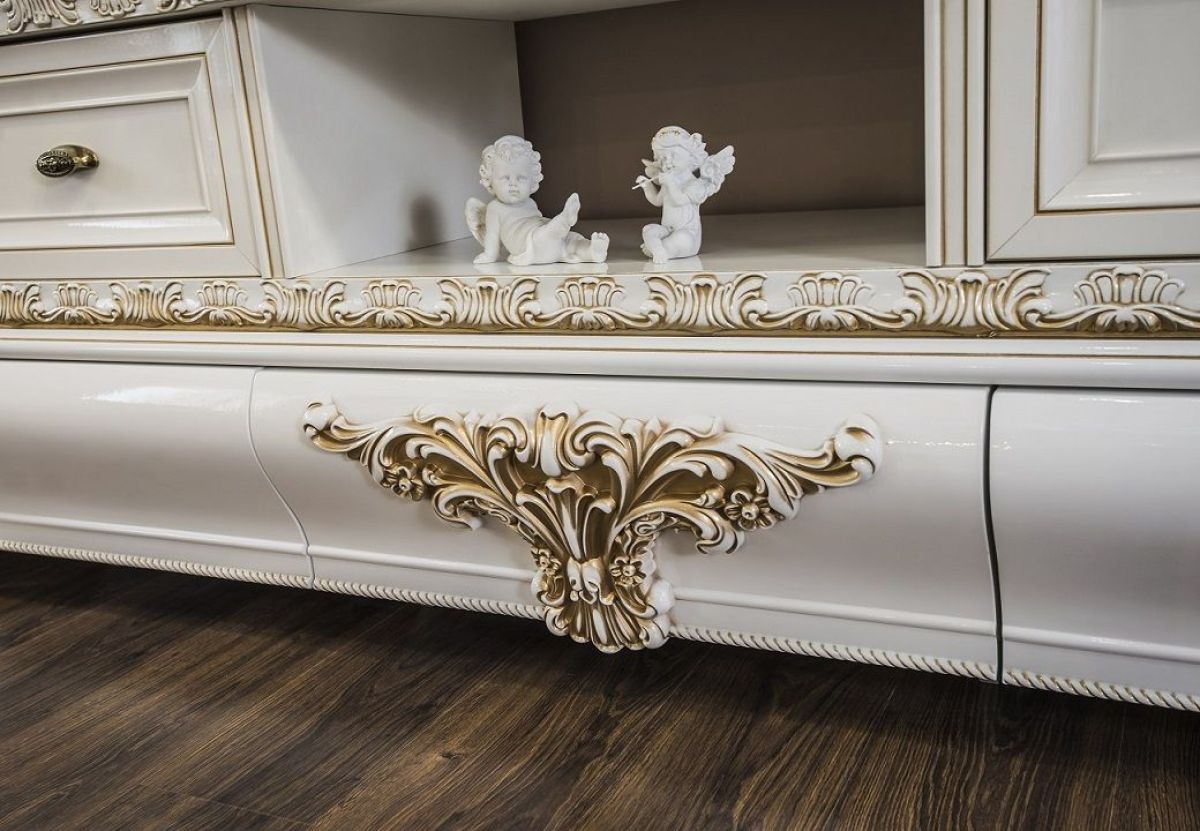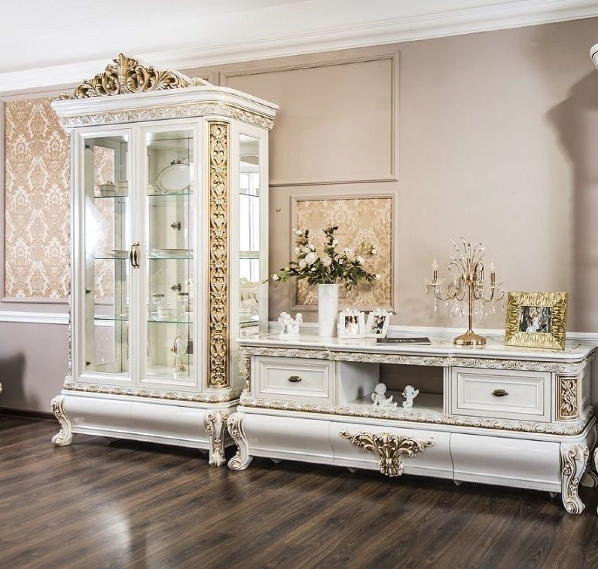 Гостиная Алсу 2+2 белый глянец - состоит из тв тумбы и двух двухстворчатой витрин, поистине королевская мебель созданная на фабрике ЭРА-Мебель. Алсу отличается максимально светлым тоном выкраски и глубокой золотой патиной.