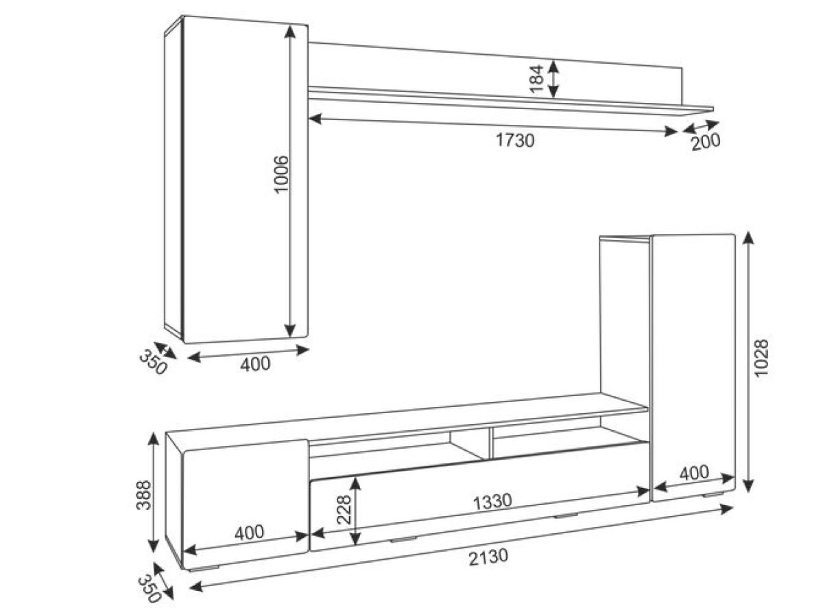 Габариты (Ш*Г*В): 2130*350*1028 (низ)/1006 (верх) мм