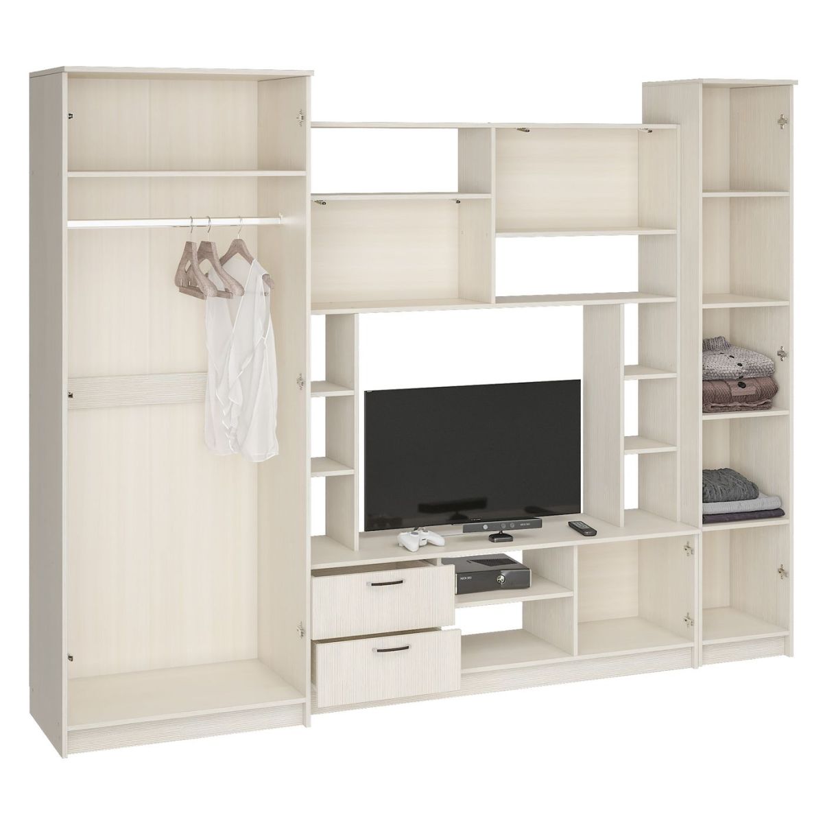 Гостиная Марта – это отличное решение для меблировки гостиной. Тёплые оттенки сделают атмосферу гостиной уютной. Кроме того, гостиная Марта содержит все необходимые модули. Шкаф, полки, ящики и нишу для одного из главных элементов — телевизора. Зеркало в полный рост визуально расширит пространство. Множество расцветок на выбор.