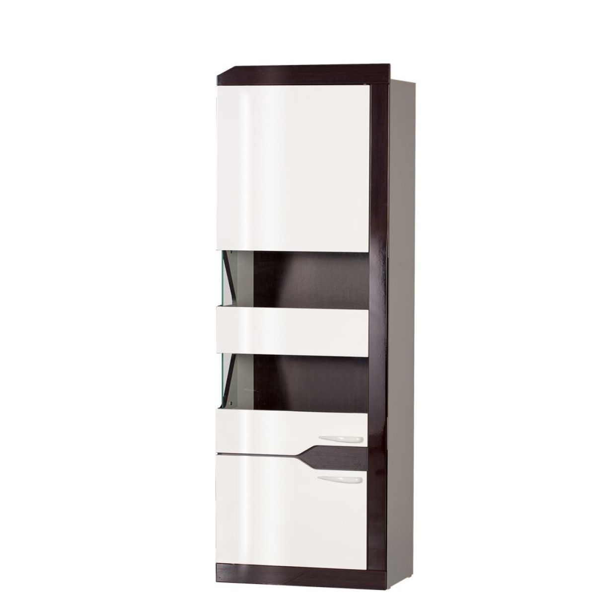 Благодаря сочетанию 2-х контрастных декоров – белого и венге с глянцевыми и матовыми поверхностями, а также оригинальному дизайну двухсторонних стеклянных витрин и декоративному приему стыковки модулей, «Ронда» выглядит эффектно и стильно. Завершают внешний облик белые глянцевые ручки итальянского производства.