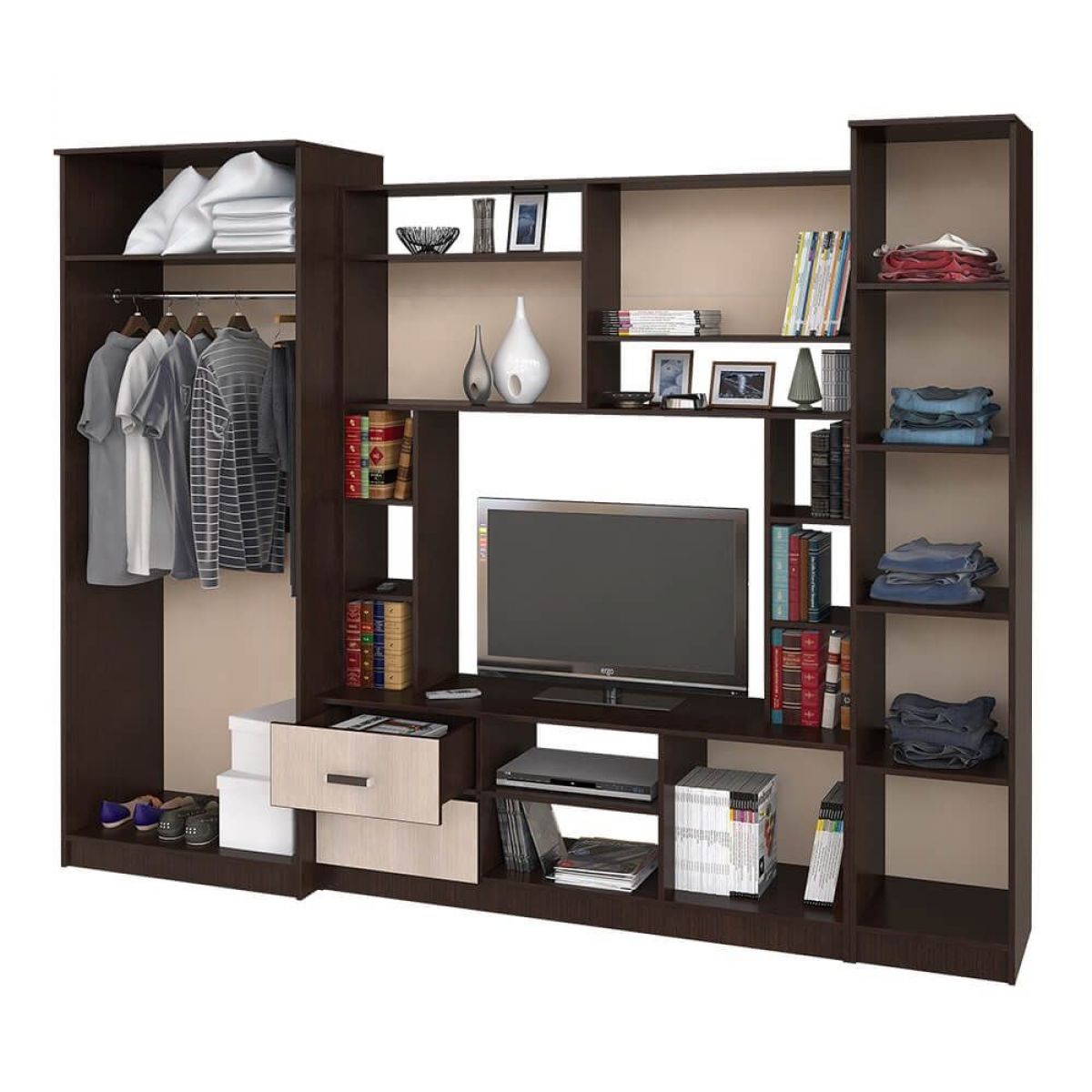 Гостиная «Флора» невероятно вместительный вариант. В ней вы сможете расположить телевизор, всю необходимую аудиотехнику, а верхние и нижние ящики прекрасно подойдут для документов и личных вещей. Кроме того, модель гостиной Флора имеет два полноценных шкафа, один из которых двустворчатый и оснащен штангой для вешалок с вашей одеждой. Наличие зеркальной дверцы с лаконичным цветочным принтом позволяет расширить пространство.