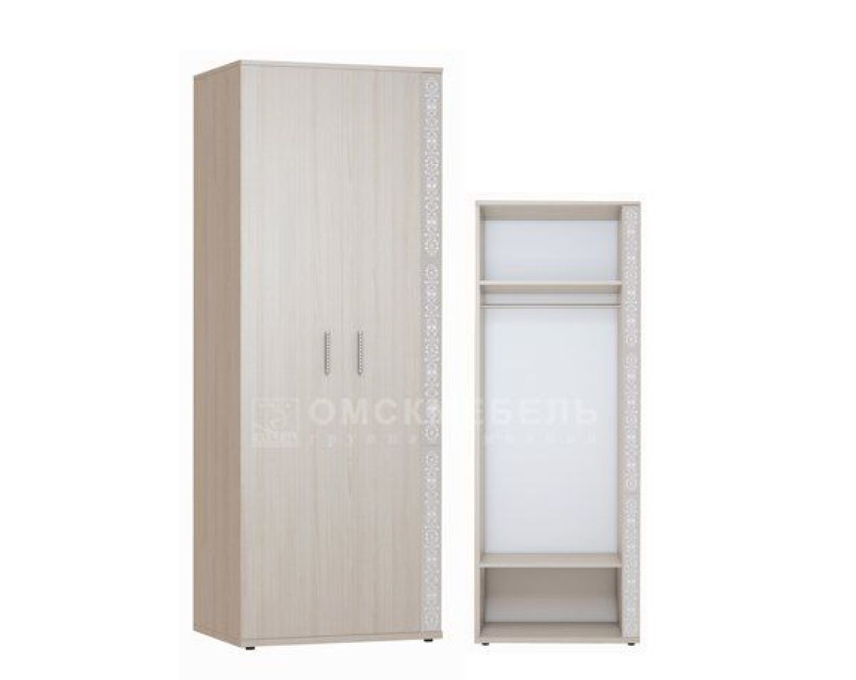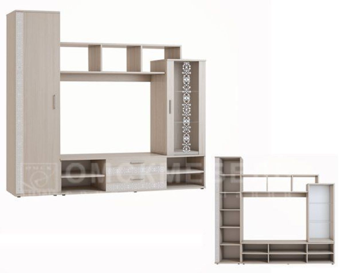 Утонченный рисунок с цветочным мотивом и стразы на зеркальных фасадах делают гостиную более воздушной и праздничной. Есть выдвижные ящики для различных вещей и отделения с полками для сервиза, открытые полки, например, для фоторамок. В гостиной предусмотрена подсветка полок.