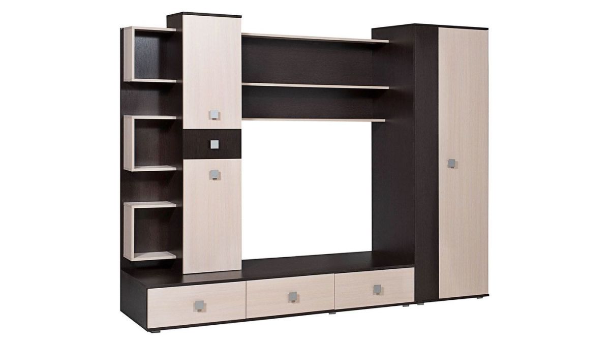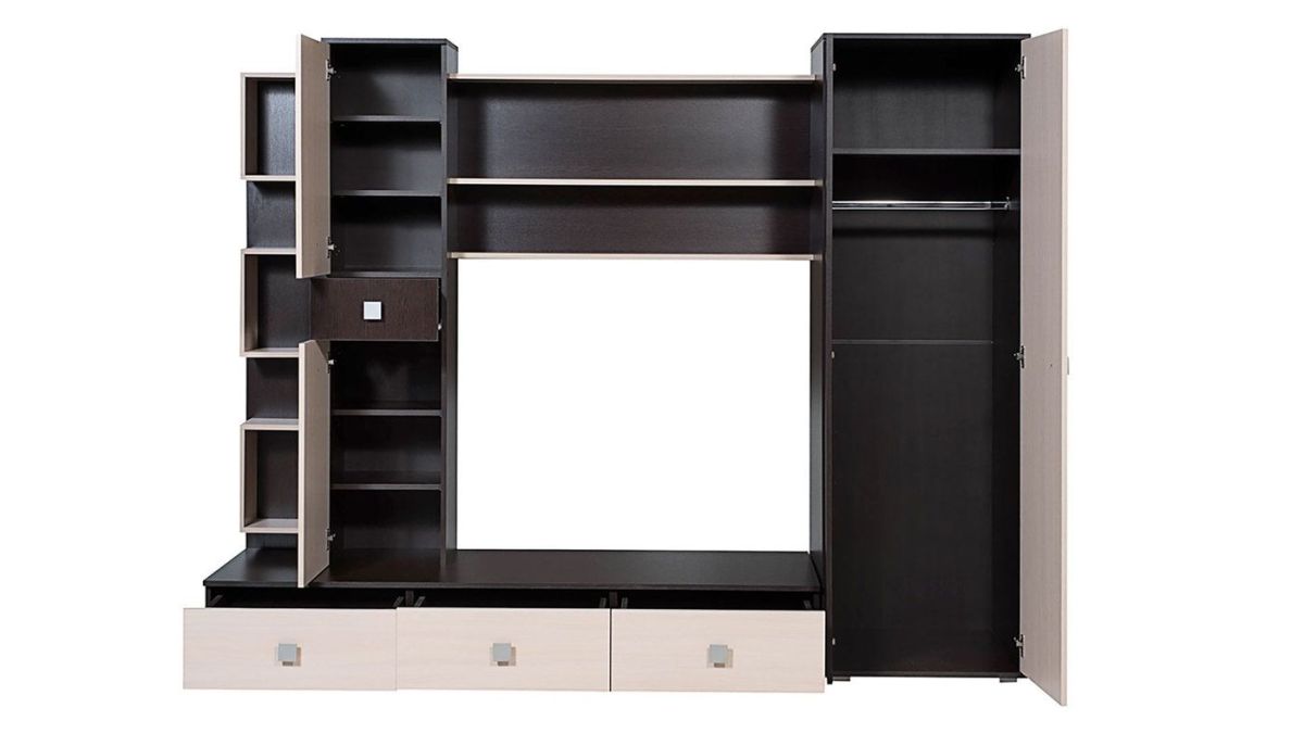 Современный дизайн стенки придает ей особую элегантность. Несомненно, стенка привлечет к себе внимание ваших гостей и станет украшением гостиной. Классические строгие линии, сочетание открытых и закрытых отделов. Удобные ящики. Шкаф платяной.