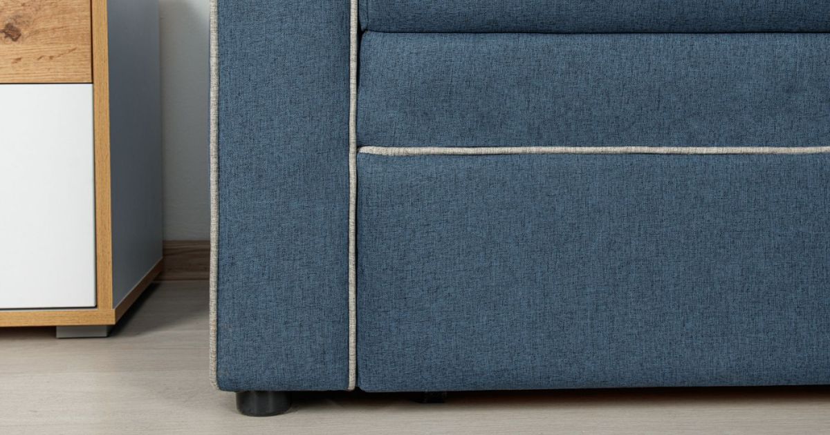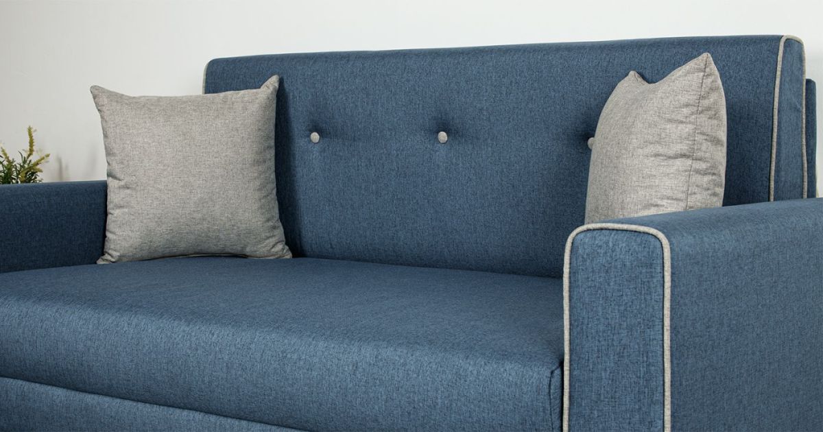 Декор: Декоративный контрастный кант по торцу спинки, торцу подлокотника, по верхнему срезу царги. Утяжки с пуговицами на спинке дивана. Две декоративные подушки в контрастной ткани.