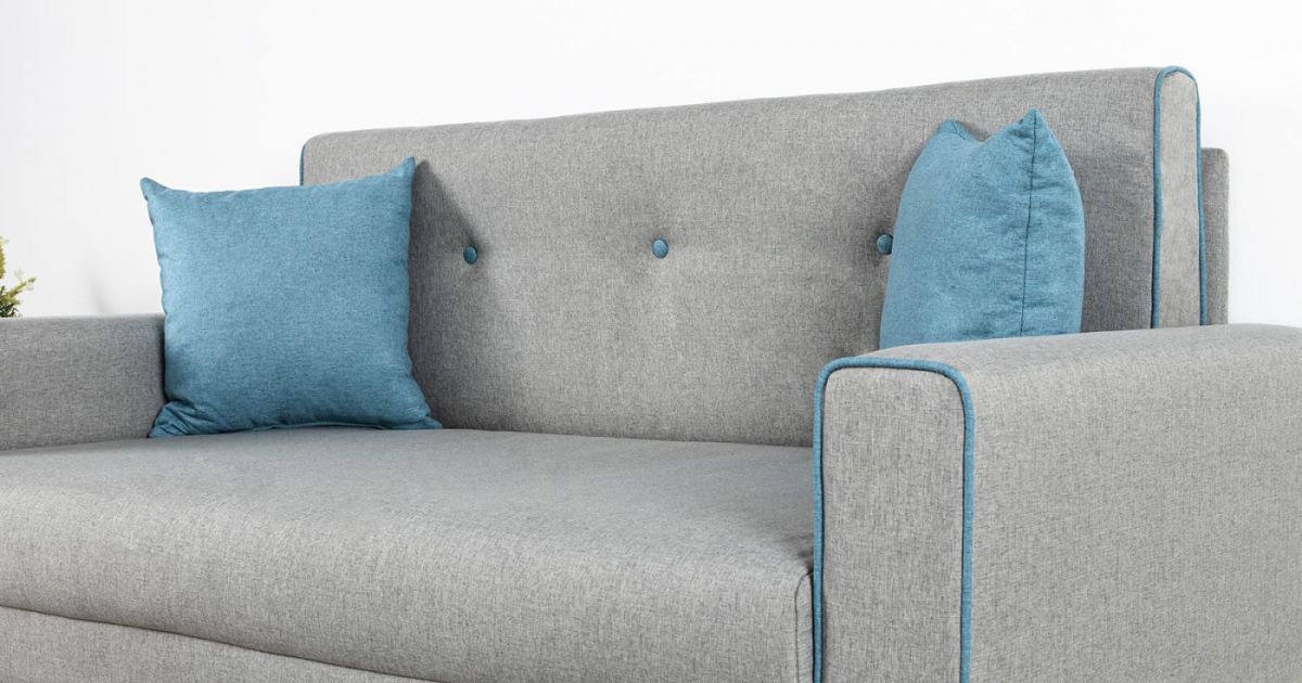 Декор: Декоративный контрастный кант по торцу спинки, торцу подлокотника, по верхнему срезу царги. Утяжки с пуговицами на спинке дивана. Две декоративные подушки в контрастной ткани.