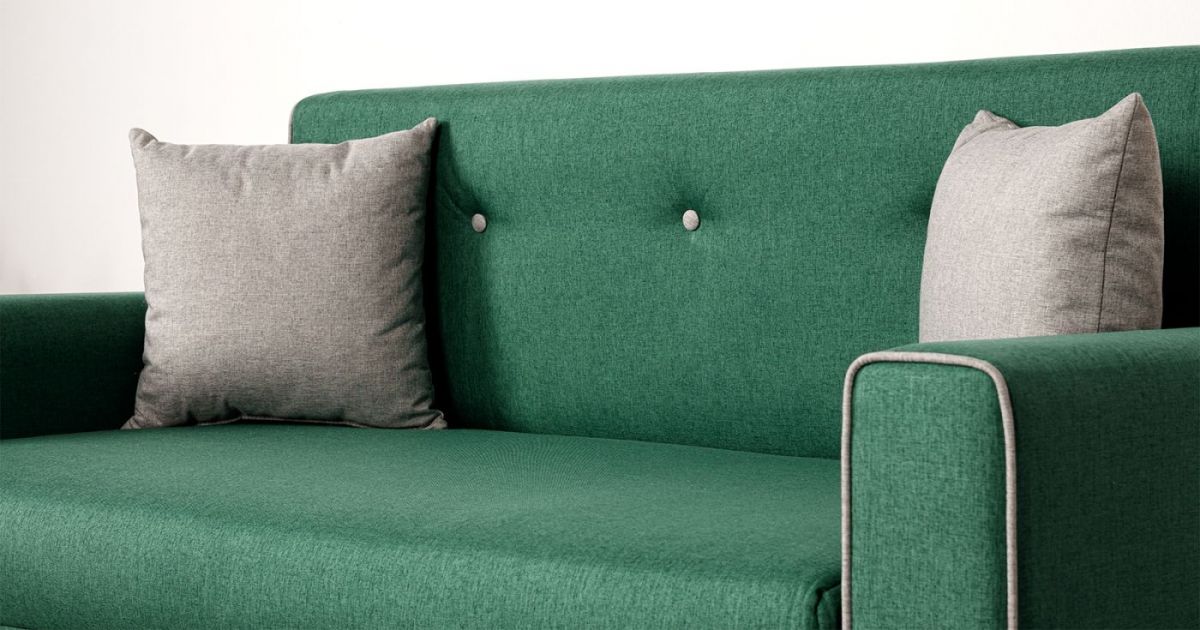 Декор: Декоративный контрастный кант по торцу спинки, торцу подлокотника, по верхнему срезу царги. Утяжки с пуговицами на спинке дивана. Две декоративные подушки в контрастной ткани.