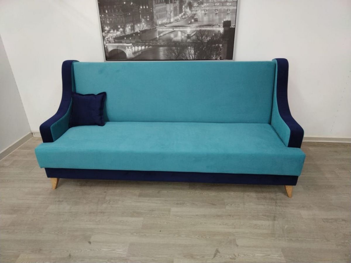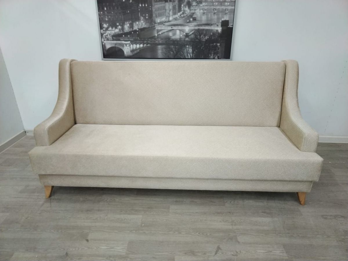 Спальное место дивана основано на пружинных блоках, соединенных между собой механизмом раскладки «Книжка». Имеется вместительный короб для бельевых принадлежностей. Съемные подлокотники упрощают процесс транспортировки.