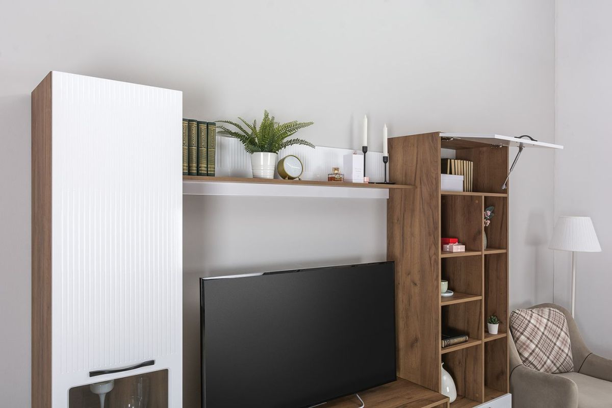 Оригинальное и стильное решение для гостиной. Белый глянцевый декор на фасадах прочно ассоциируется с безграничным пространством и чистотой, а вертикальные линии фрезеровки создают интересную игру света и тени.