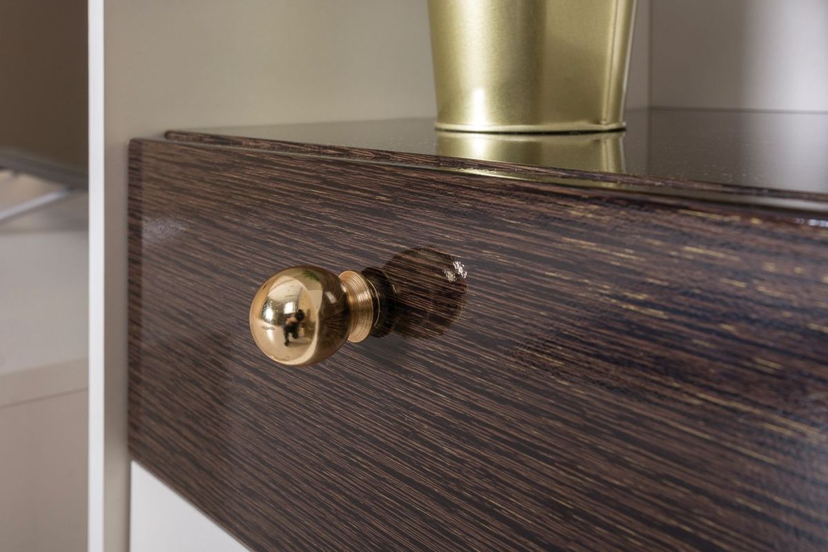 Мягкая и приятная цветовая гамма привлекут вас и ваших гостей своей утонченностью: шоколадный оттенок глянцевого дерева с золотистым отблеском "заиграет" при любом освещении, а в сочетании с точечной подсветкой и "золотыми" ручками придаст вашему дому изысканный и легкий образ.