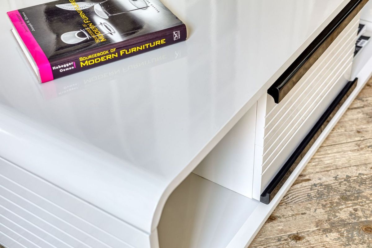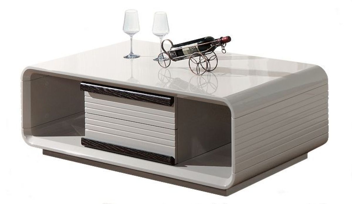 Большой журнальный стол с двумя выдвижными ящиками. Цвет стола: светло-серый, теплого оттенка Grey beige (серый беж). Ручки ящиков изготовлены из бука, покрытого лаком "темный орех". На фасадах ящиков и боковых стенках имеется элегантный декор в виде горизонтальных линий. Размеры ящиков: 500х350хh140 мм.