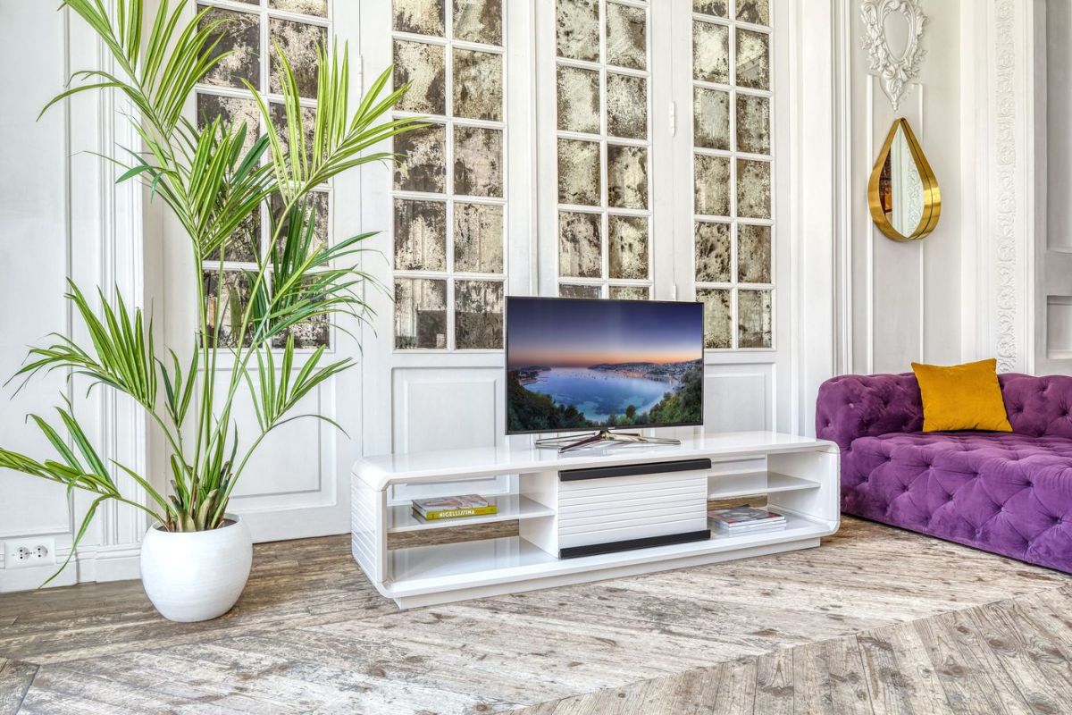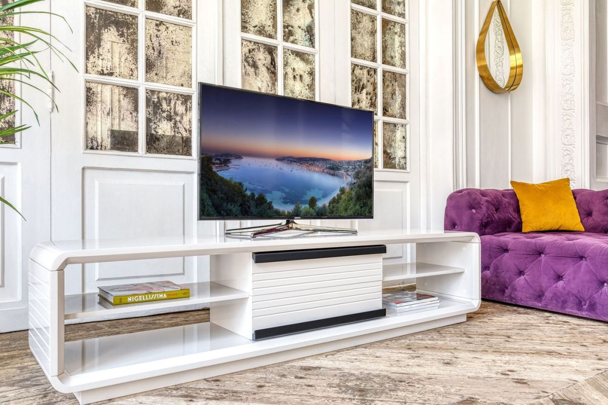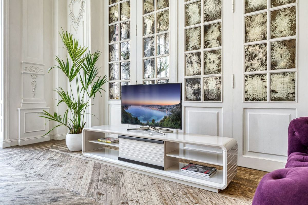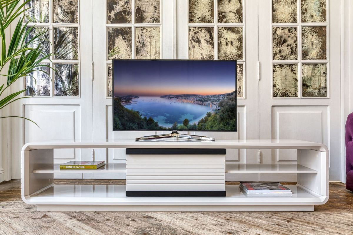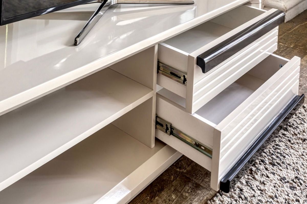 Напольная тумба под телевизор с двумя выдвижными ящиками и четырьмя нишами под аппаратуру. Размеры ниш и ящиков: 600х350хh140 мм.
