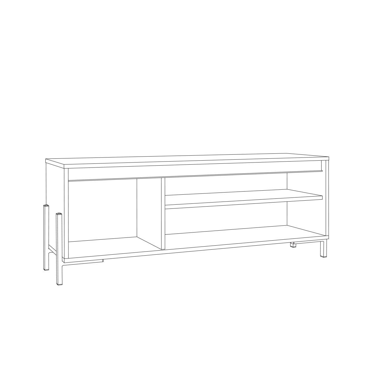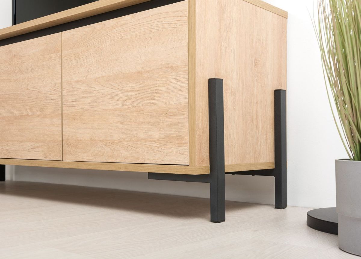 Минималистичный современный дизайн тумбы дополняют металлические опоры в стиле лофт. Анодированный алюминиевый профиль служит конструктивным и декоративным элементом, надежной фурнитурой при эксплуатации. Новый декор ЛДСП наделен естественным тиснением и максимально приближен к натуральной древесине. Корпус выполнен из плиты с увеличенной толщиной ЛДСП 18 мм с кромкой 1 мм. Такой материал готов к повышенным нагрузкам, а толстая кромка делает тумбу более устойчивой перед негативными факторами внешней среды. В столешнице имеется вырез под провода для подключения мультимедиа техники.