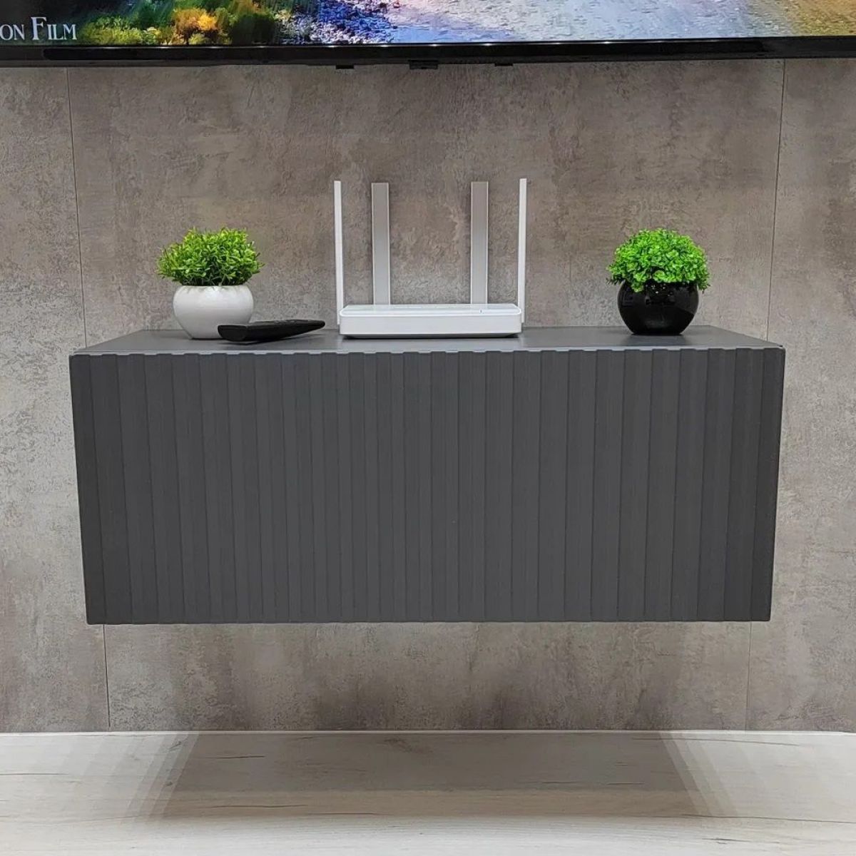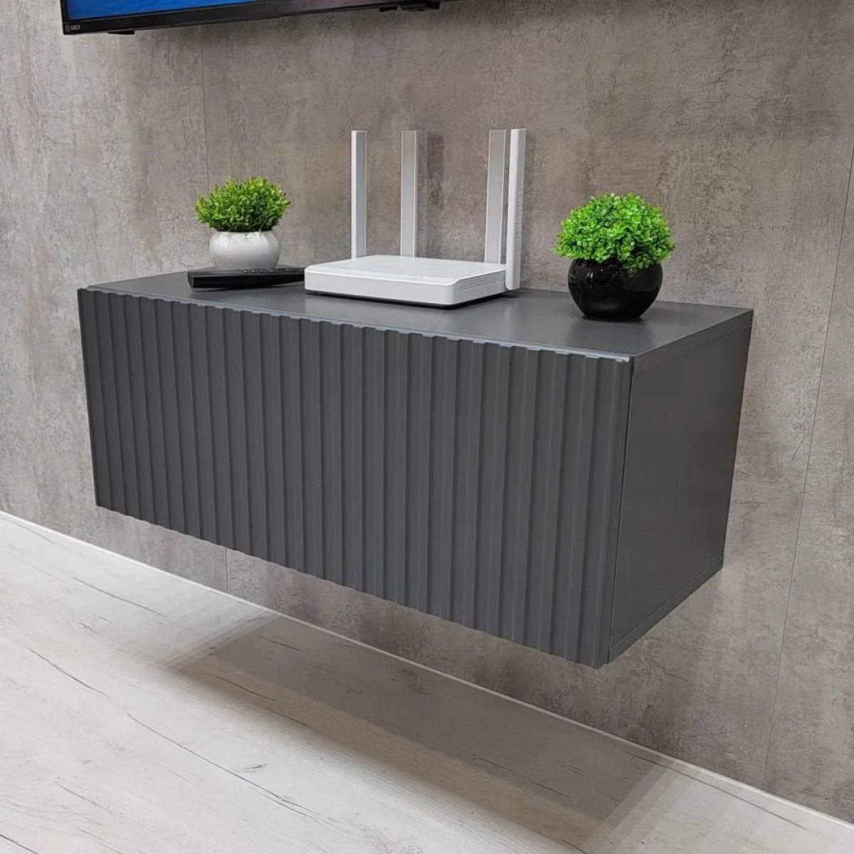 Благодаря своей компактности тумба под ТВ подвесная поможет сэкономить пространство, избежать ощущения загромождённости гостиной, спальни или детской комнаты, а рифлёный фасад будет акцентировать
