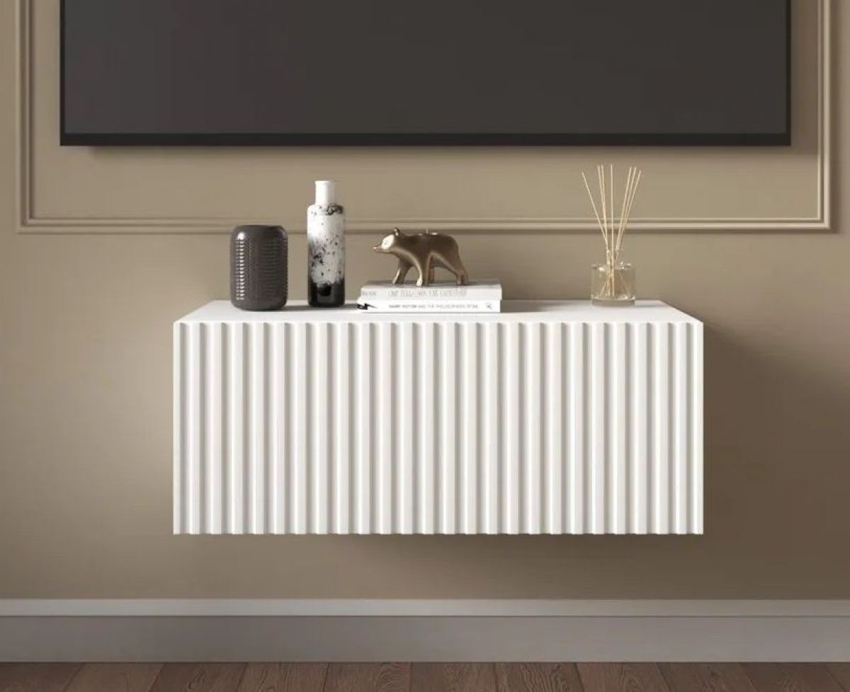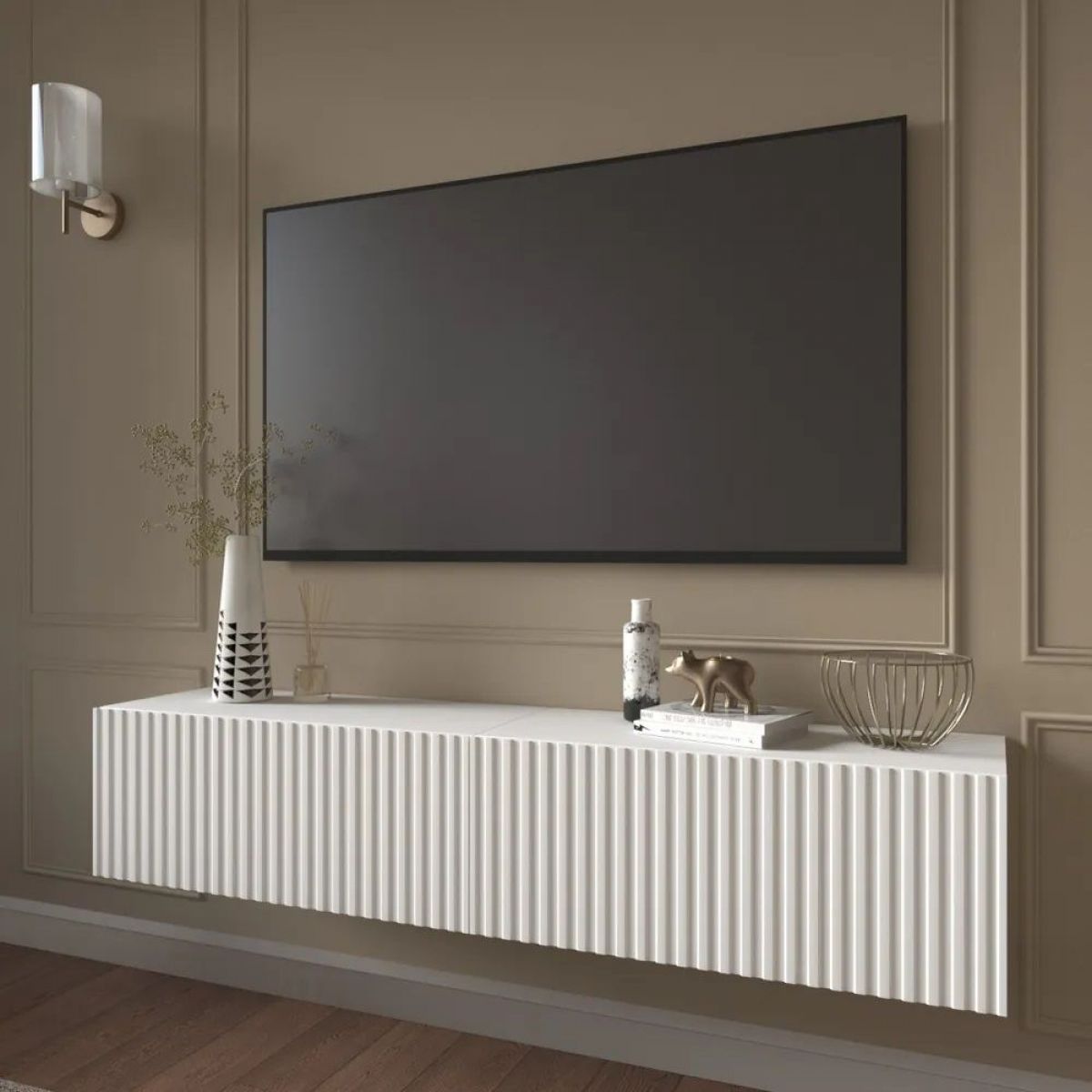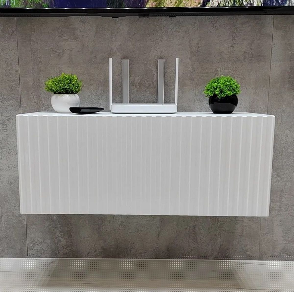 Благодаря своей компактности тумба под ТВ подвесная поможет сэкономить пространство, избежать ощущения загромождённости гостиной, спальни или детской комнаты, а рифлёный фасад будет акцентировать