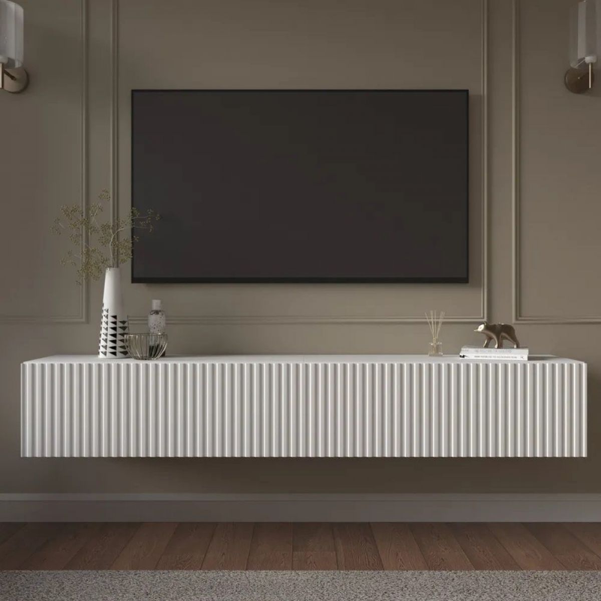 Благодаря своей компактности тумба под ТВ подвесная поможет сэкономить пространство, избежать ощущения загромождённости гостиной, спальни или детской комнаты, а рифлёный фасад будет акцентировать