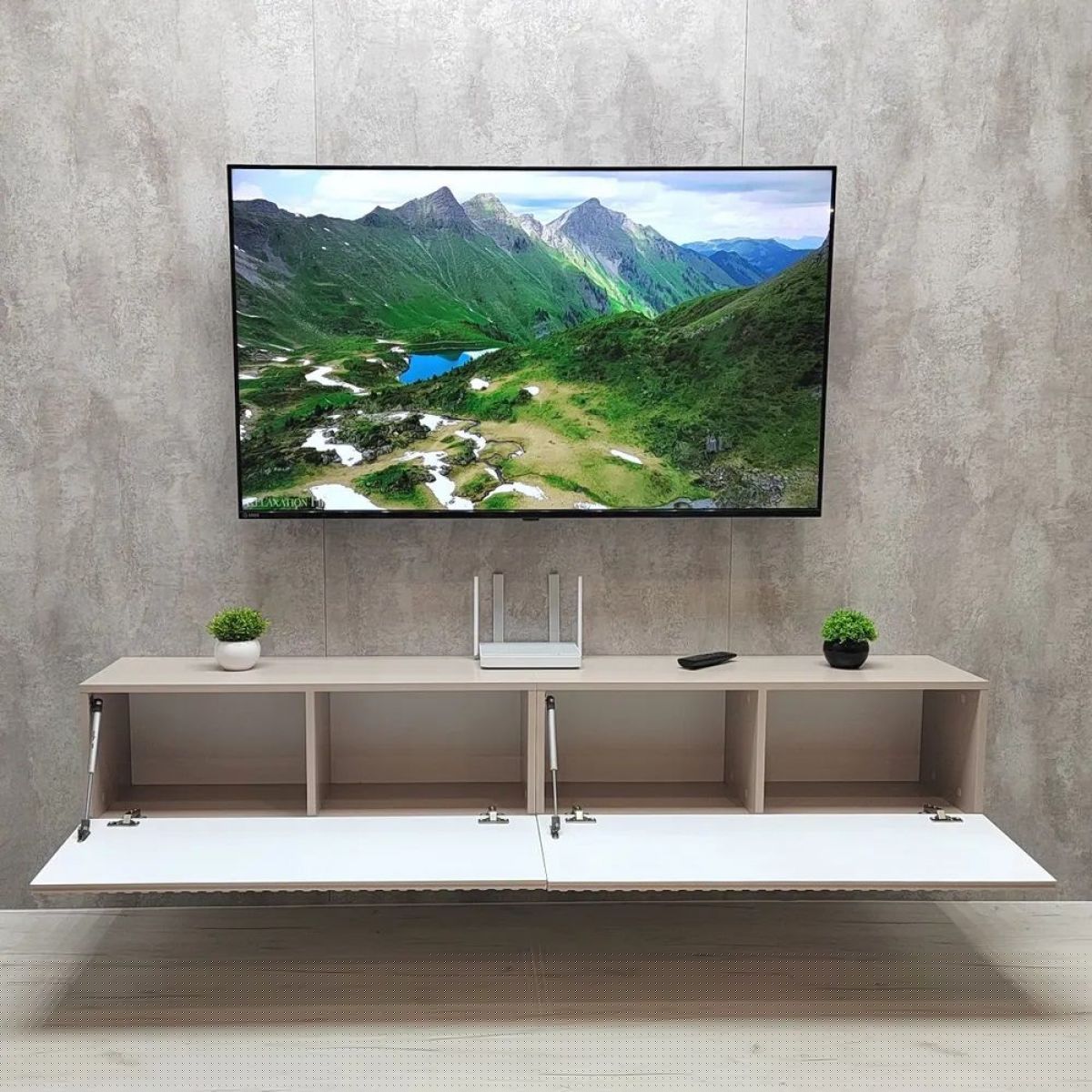 Вы можете подвесить одну тумбу под ТВ рядом с другой, чтобы получилась одна длинная тумба под телевизор в стиле лофт, длиной 180 см.