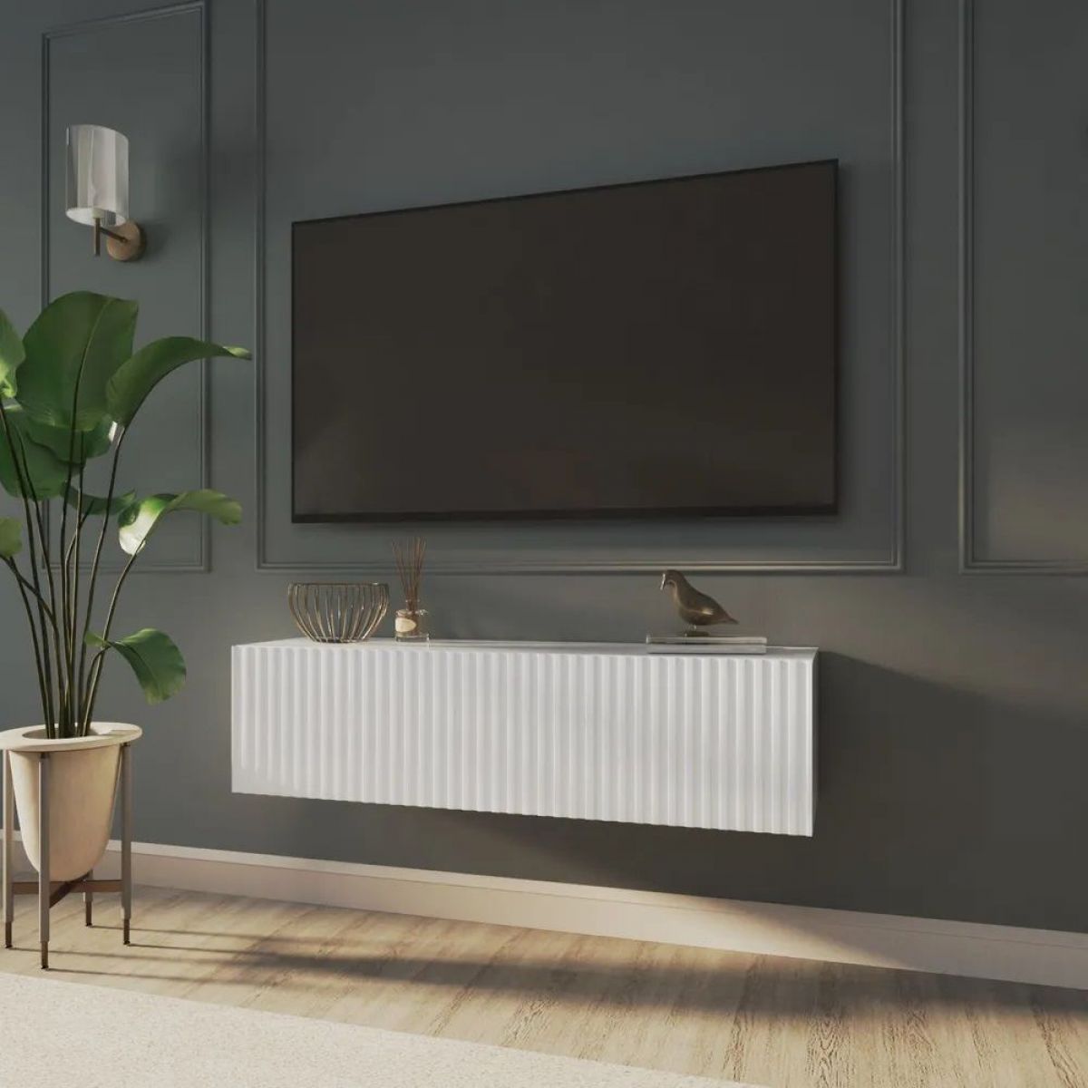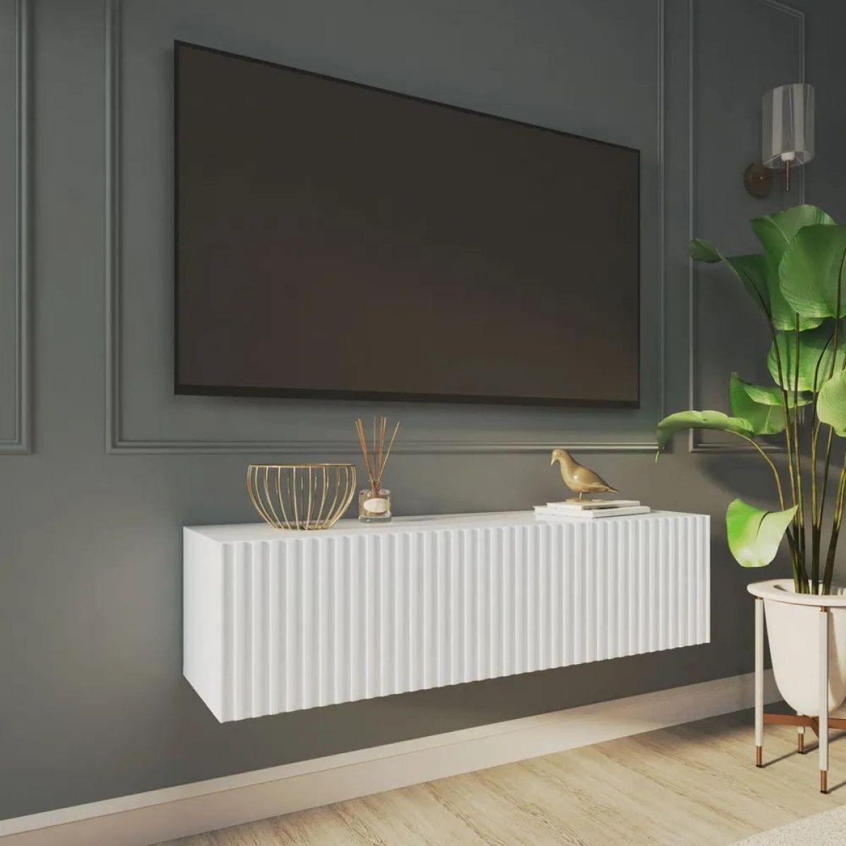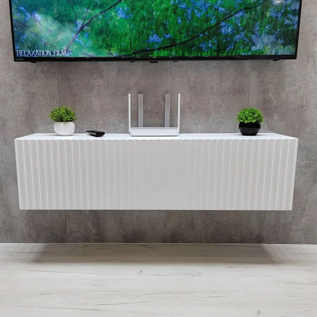 Благодаря своей компактности тумба под ТВ подвесная поможет сэкономить пространство, избежать ощущения загромождённости гостиной, спальни или детской комнаты, а рифлёный фасад будет акцентировать
