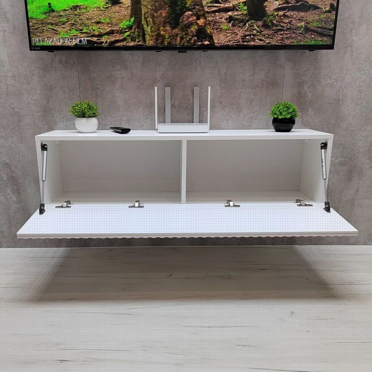 Вы можете подвесить одну тумбу под ТВ рядом с другой, чтобы получилась одна длинная тумба под телевизор в стиле лофт, длиной 230 см.