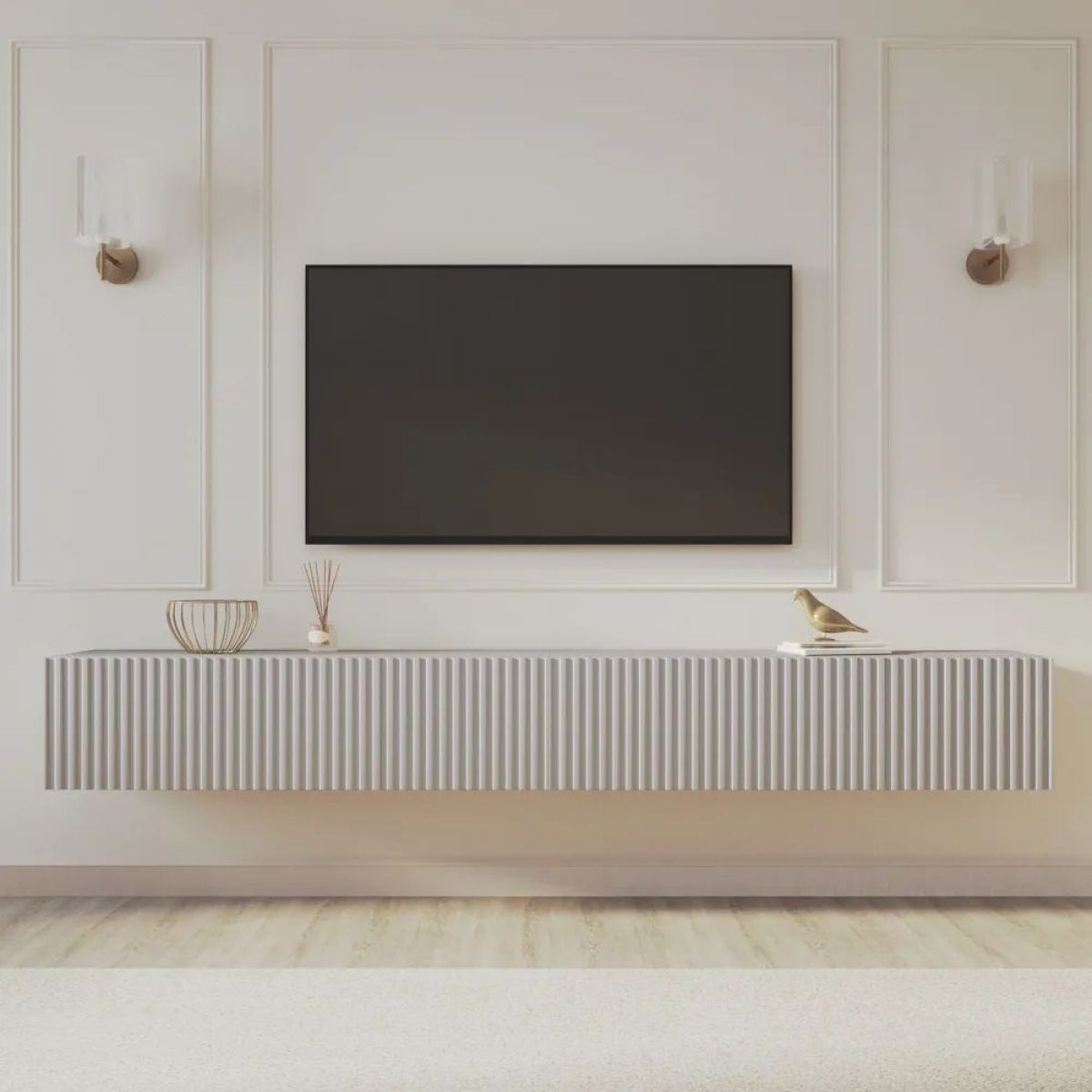 Благодаря своей компактности тумба под ТВ подвесная поможет сэкономить пространство, избежать ощущения загромождённости гостиной, спальни или детской комнаты, а рифлёный фасад будет акцентировать