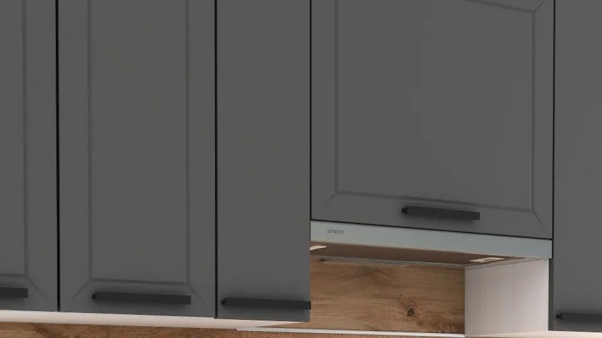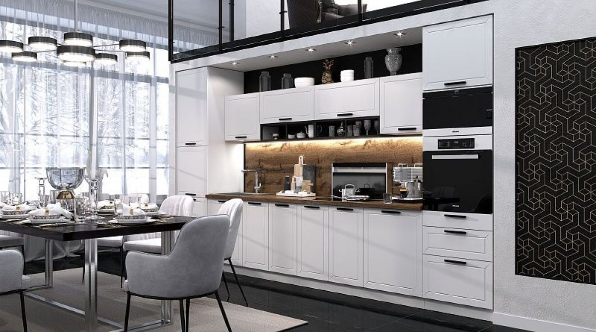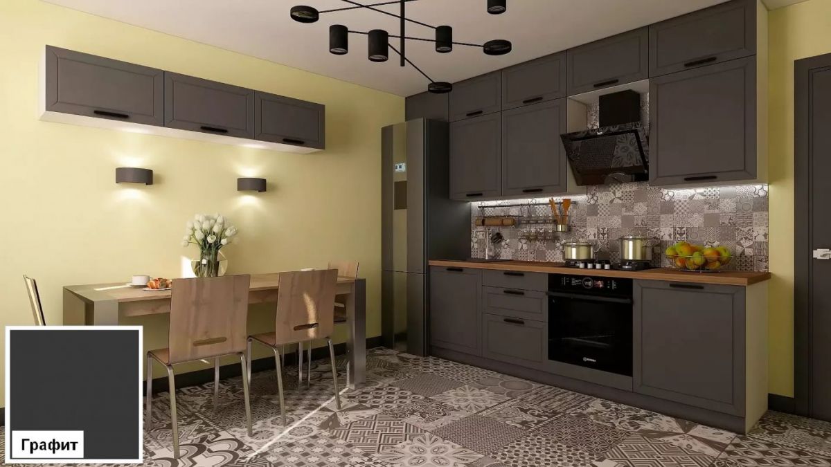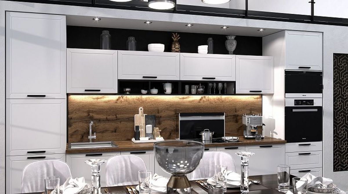 Кухня «МОНС» выполнена в современном стиле, неизменно привлекает внимание своей суперматовой пленкой ПВХ на фасадах и витринами с шелкографией.