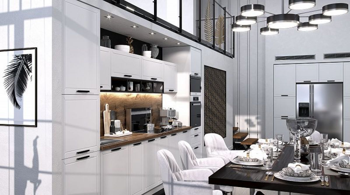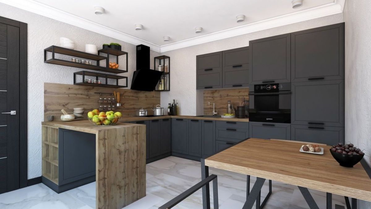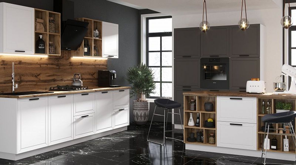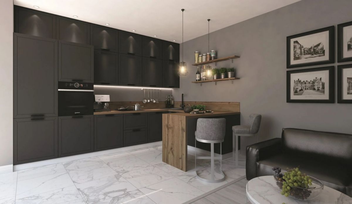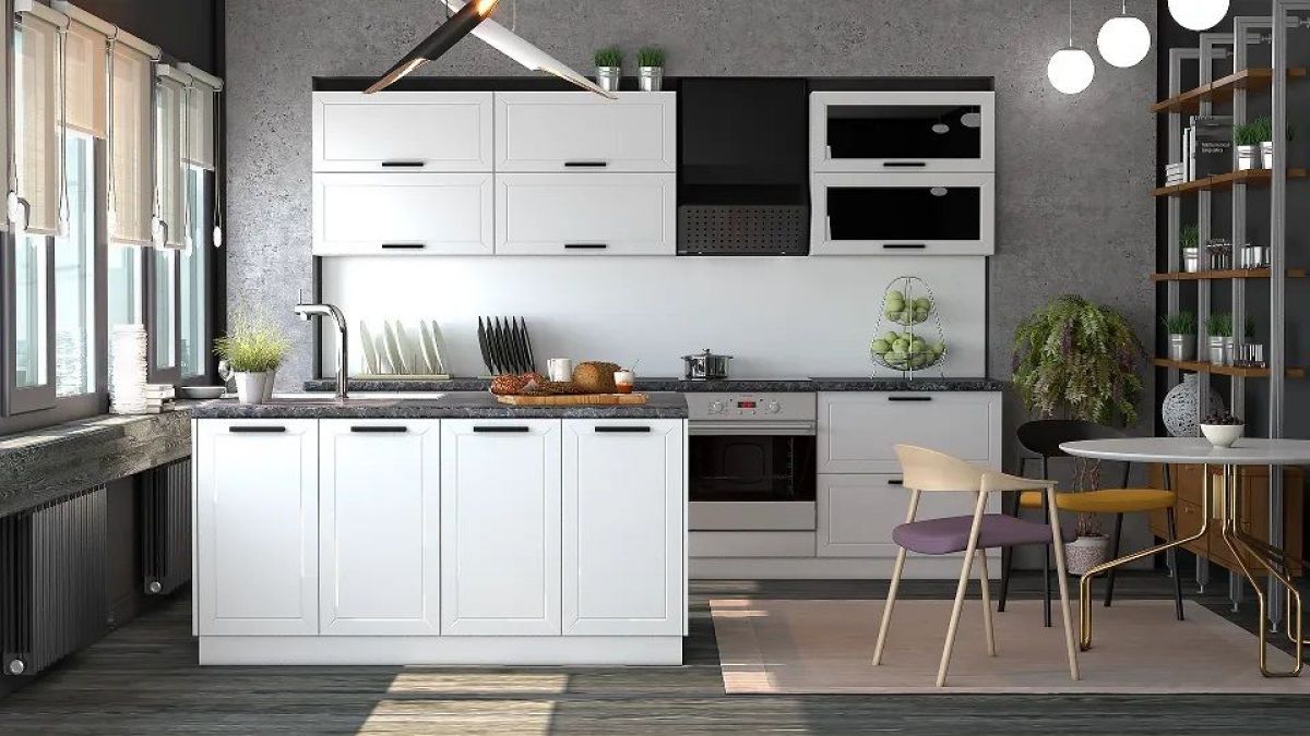 Кухня «МОНС» выполнена в современном стиле, неизменно привлекает внимание своей суперматовой пленкой ПВХ на фасадах и витринами с шелкографией.