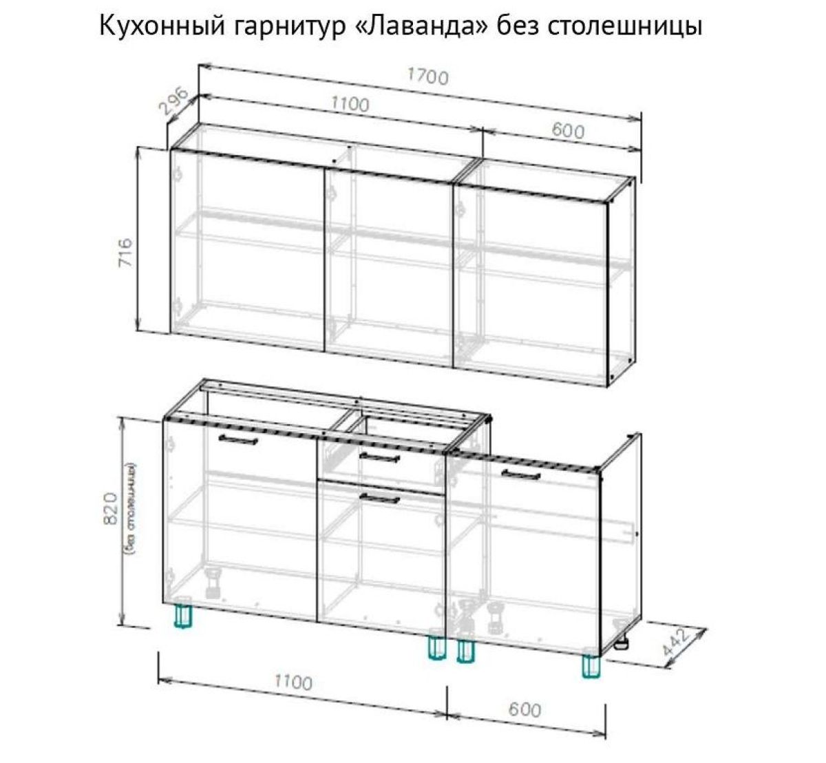 Кухня «Лаванда» - это готовый кухонный гарнитур шириной 1.7 м, который не комплектуется столешницей.