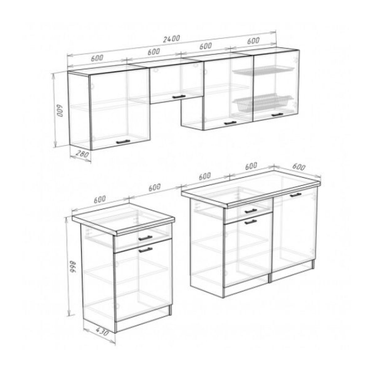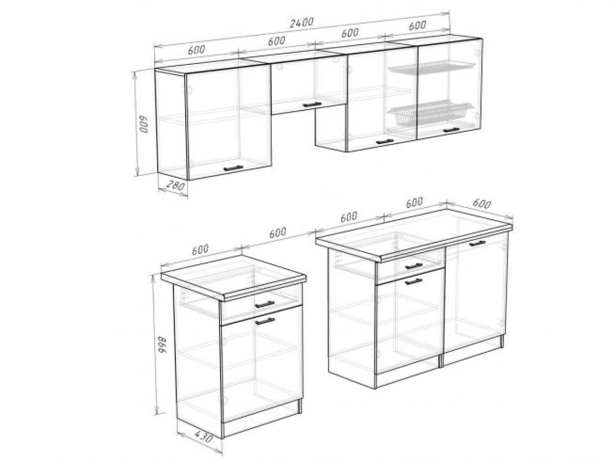 Глубина нижних шкафов: 430 мм, со столешницей 600 мм