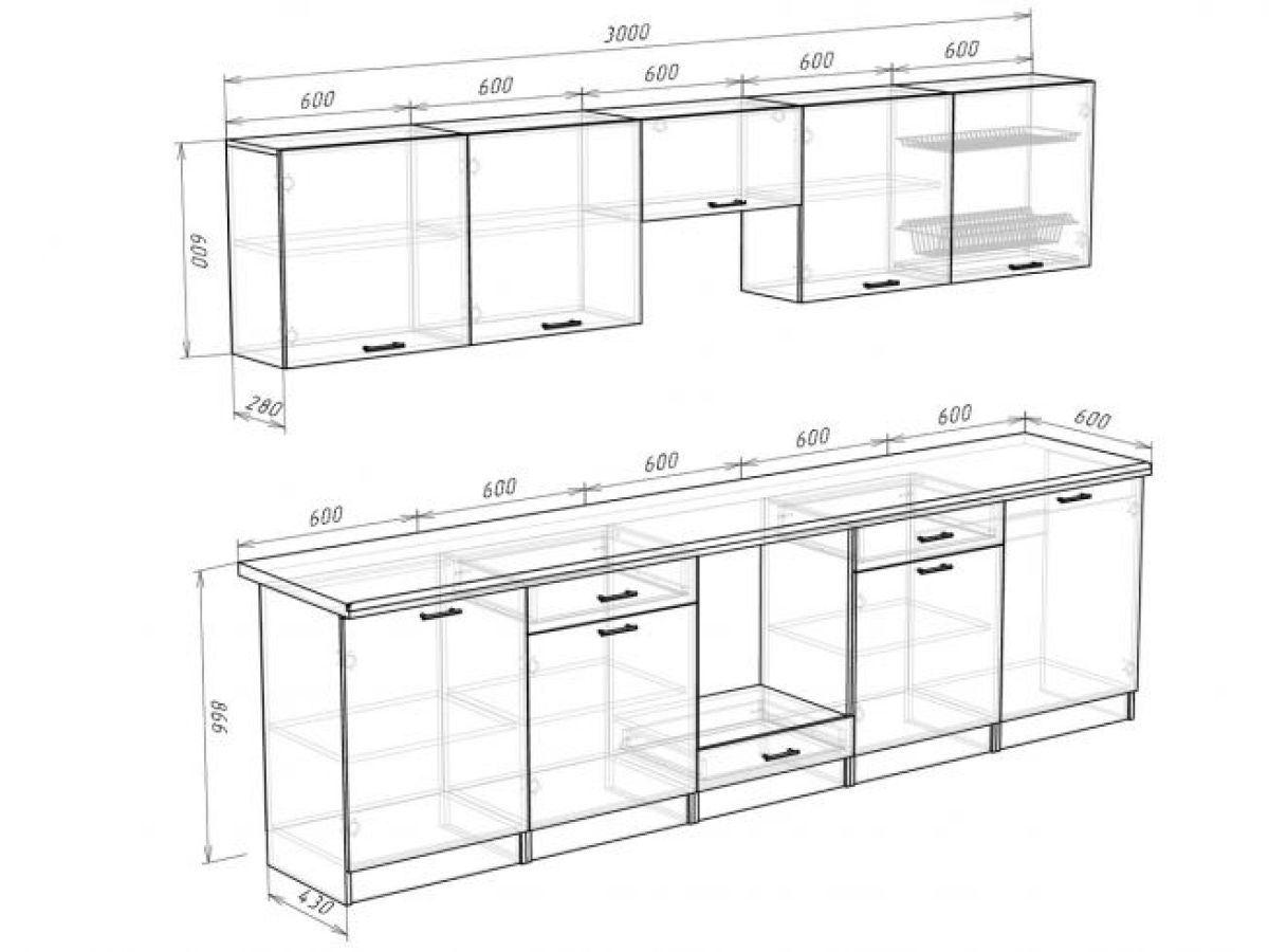 Глубина нижних шкафов: 430 мм, со столешницей 600 мм
