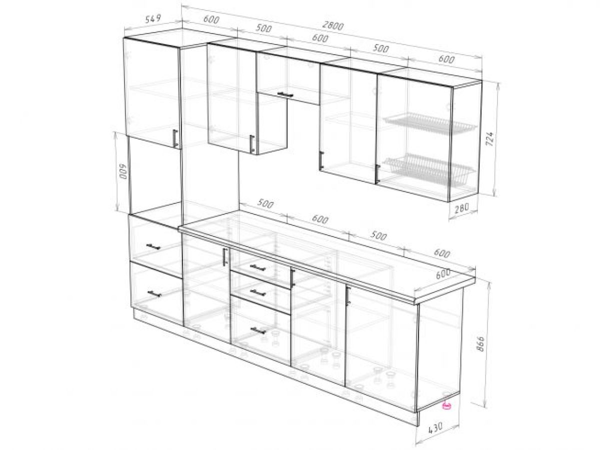 Глубина нижних шкафов: 430 мм, со столешницей 600 мм