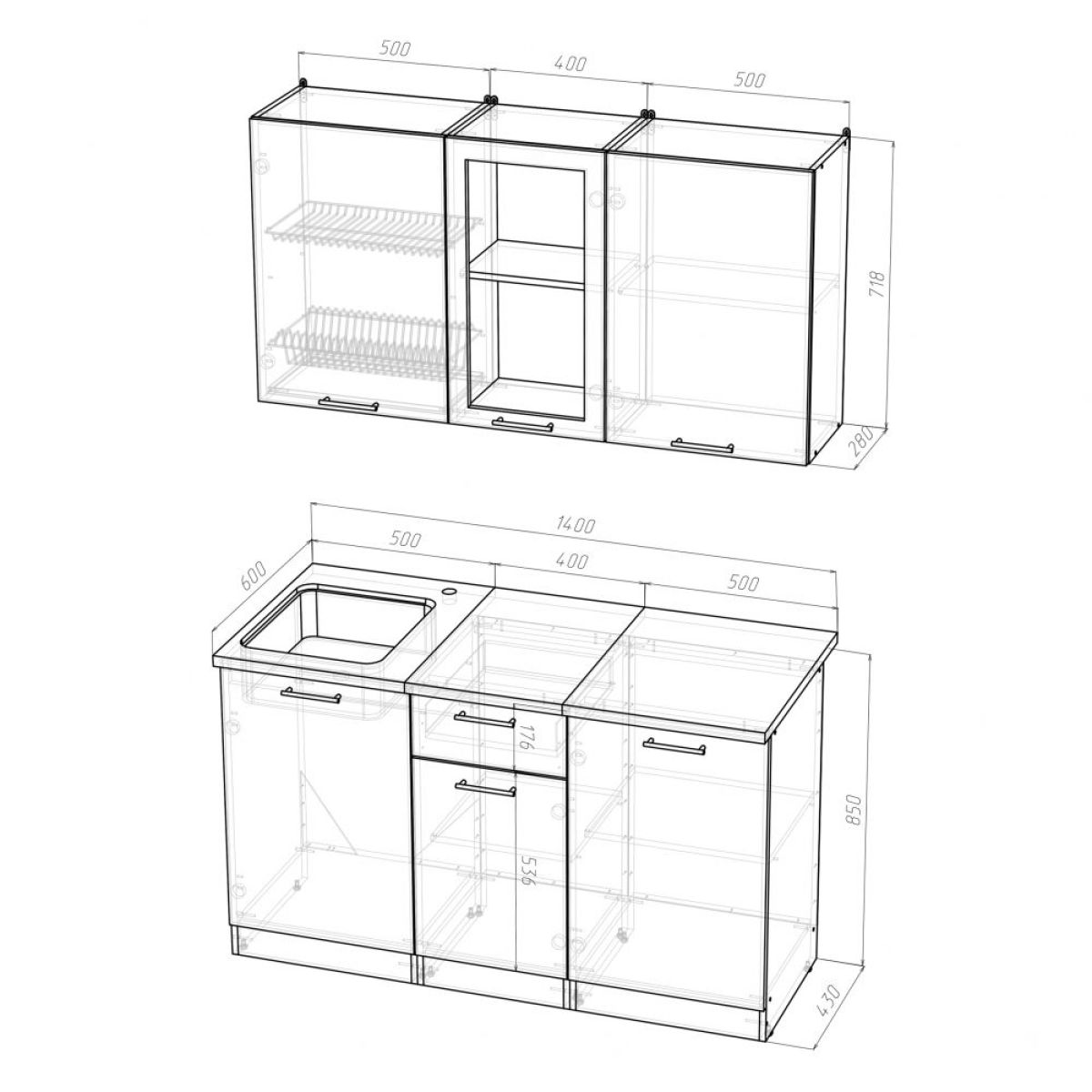 Ширина: 1400 мм; Глубина: 600 мм (со столешницей)