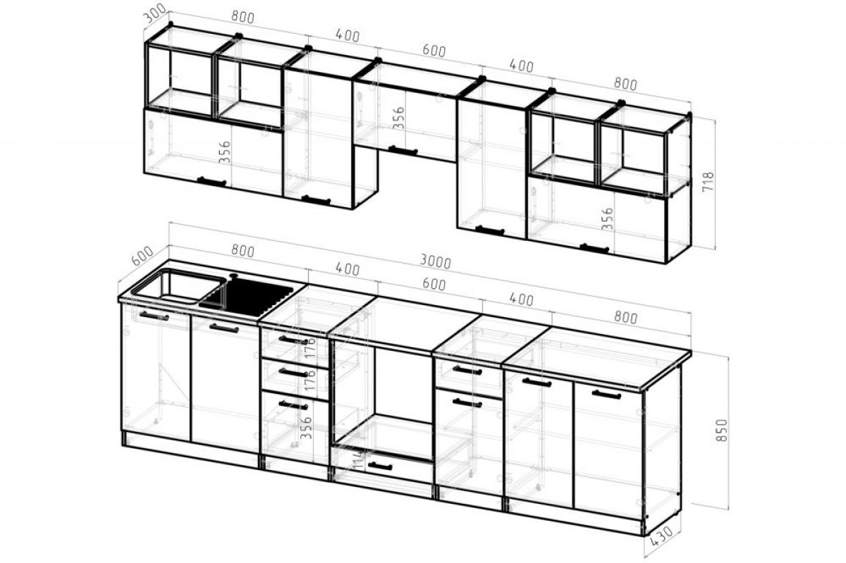 Ширина: 3000 мм; Глубина: 600 мм (со столешницей)