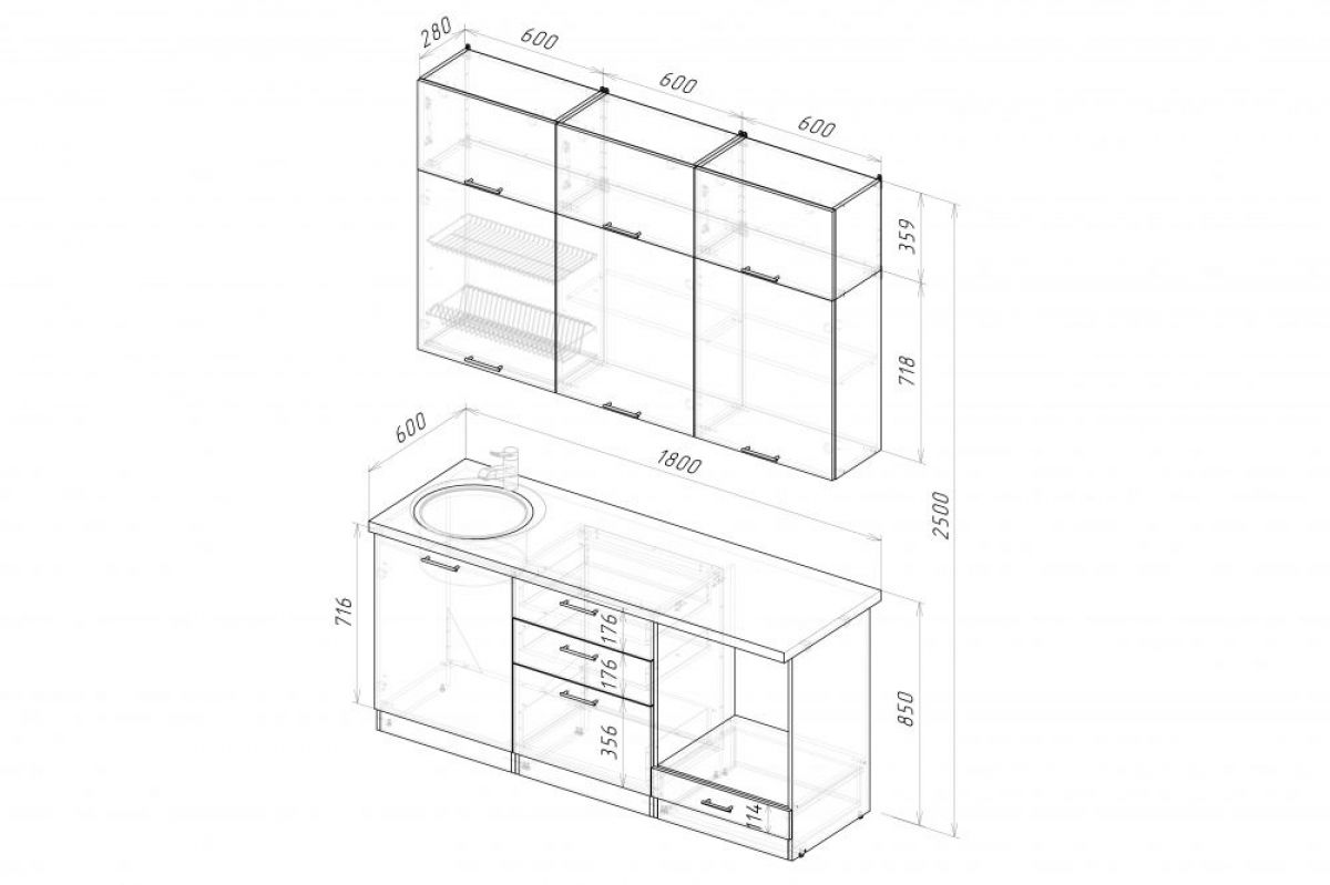 Ширина: 1800 мм; Глубина: 600 мм (со столешницей)