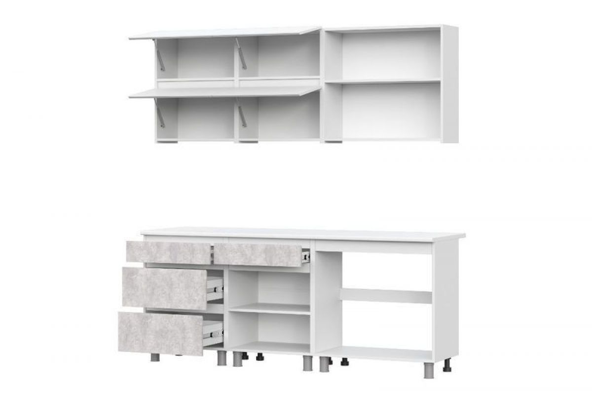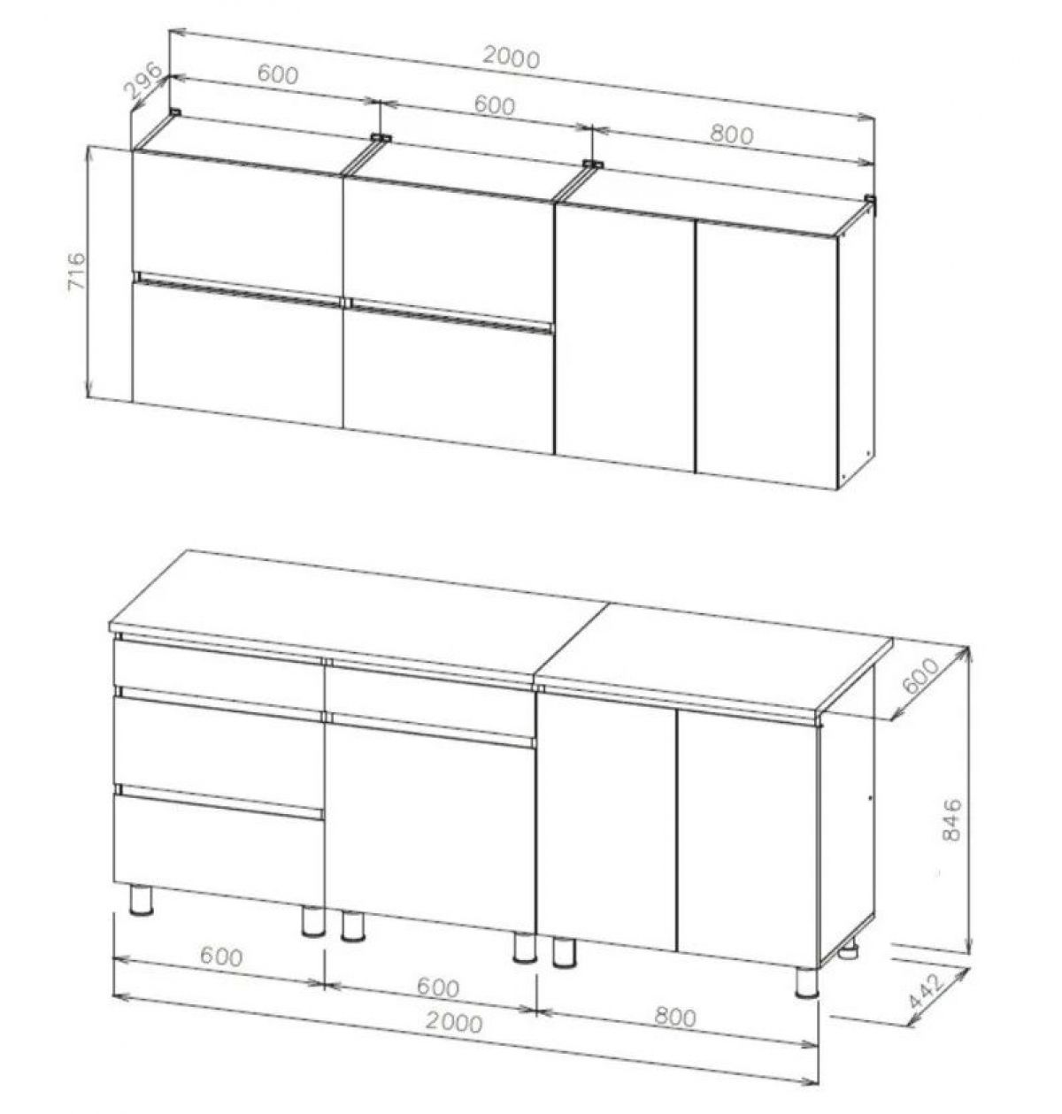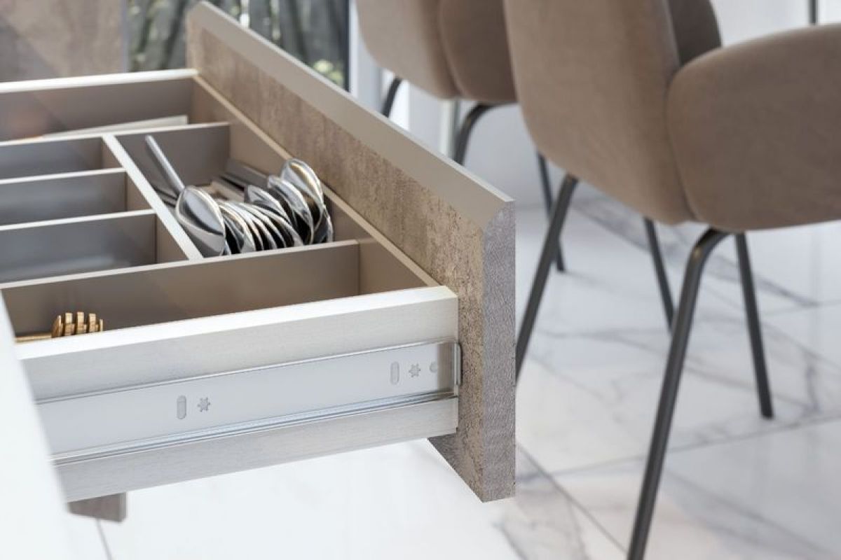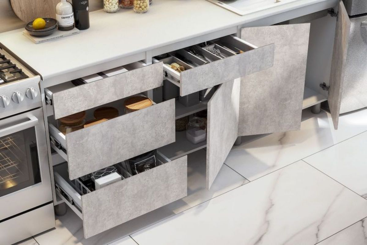 Напольные модули представлены: столом, который можно трансформировать в мойку (накладную или врезную) шириной 800 мм, столом с тремя ящиками 600 мм и столом с ящиком и створкой 600мм